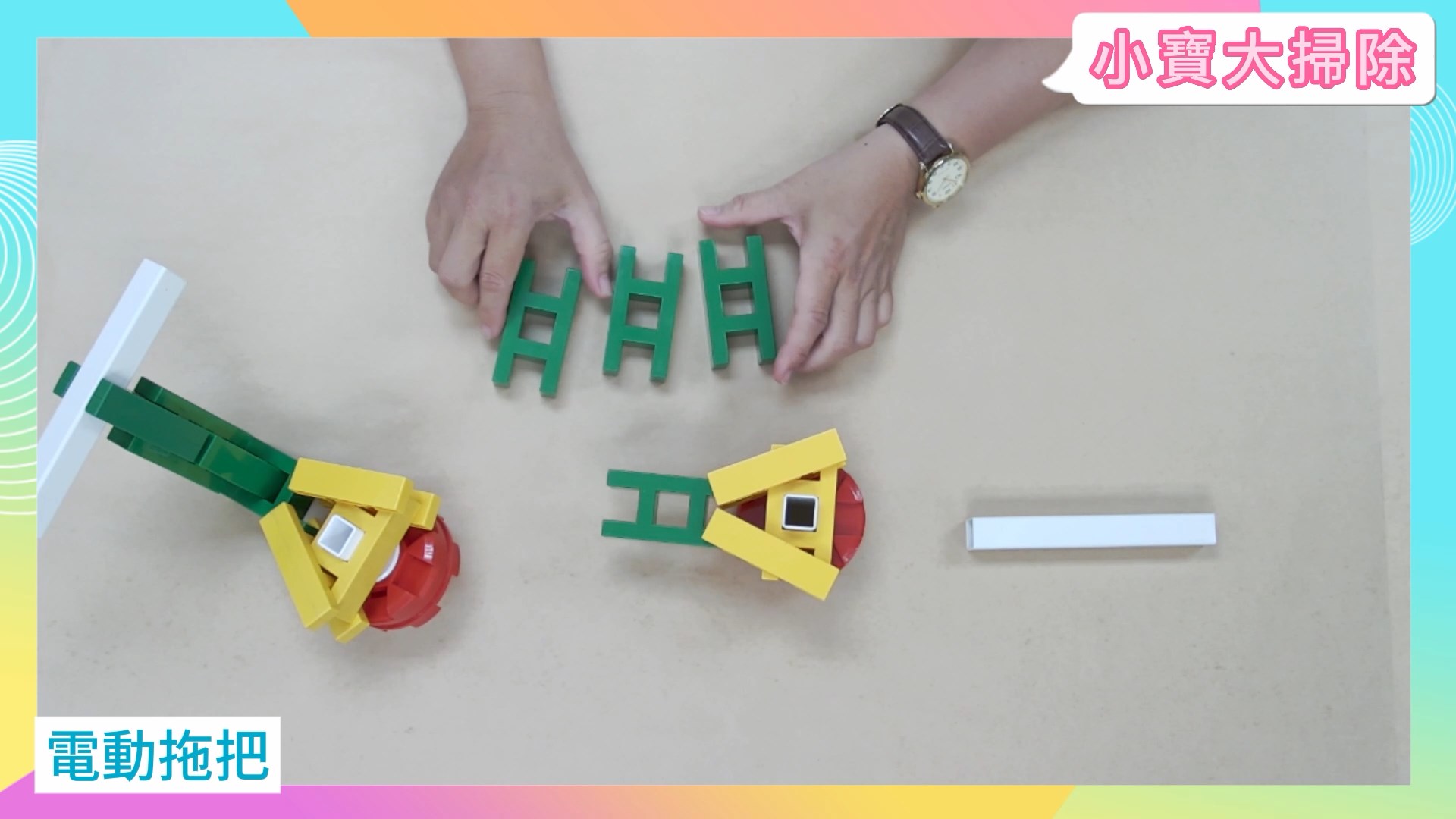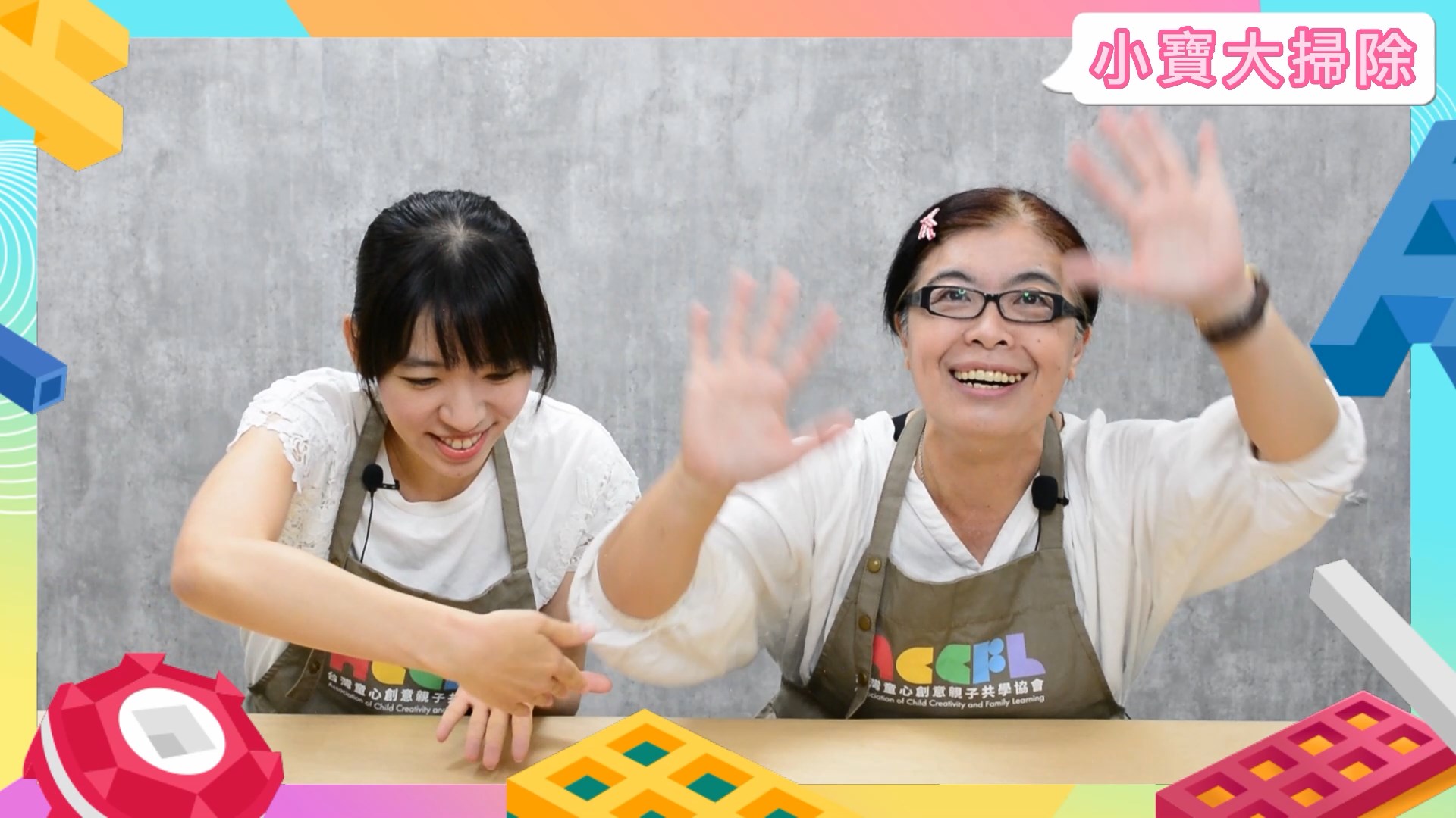 從孩子自身的清潔開始談起,循序漸進認識生活中的不同清掃工作與用具,看玩小短劇,再跟著老師一起做出相關物品:牙刷、牙膏、爐檯、鍋鏟、刷子、掃把、畚箕、油漆桶、油漆刷、梯子、電動拖把、刮鬍刀、蓮蓬頭、挖土機、推土機。完成之後,爸爸媽媽就能帶著孩子在家玩打掃遊戲囉!