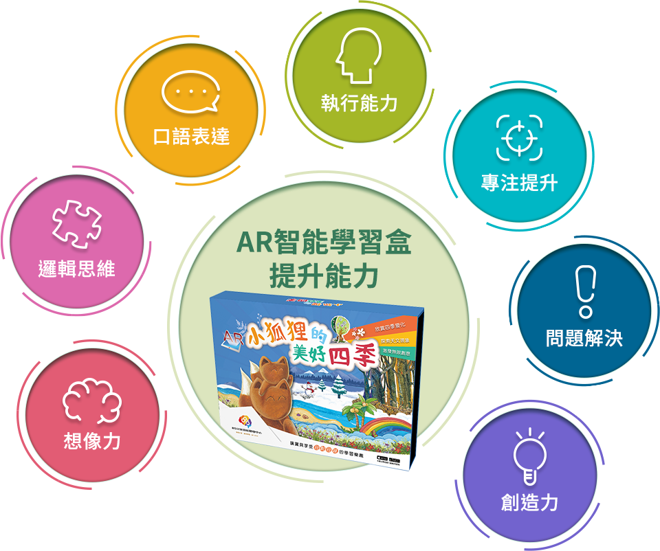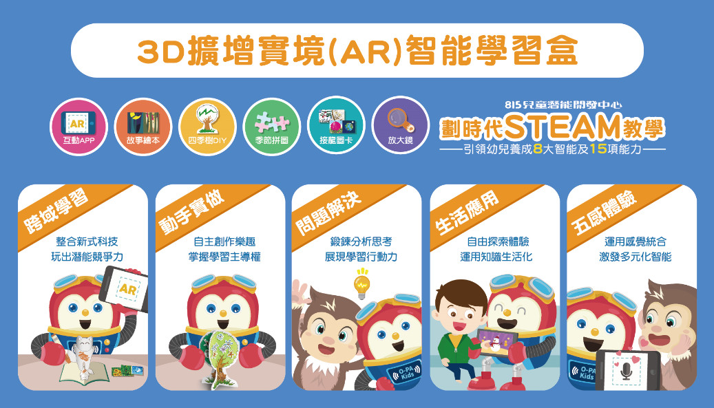 | 提升耐心與專注力,訓練手眼協調能力 | 提供5大趣味活動:AR實境秀、寶貝悅讀樂、親子FUN聲錄、圖卡玩翻天、我的作品雲,讓學習更生動有趣 |