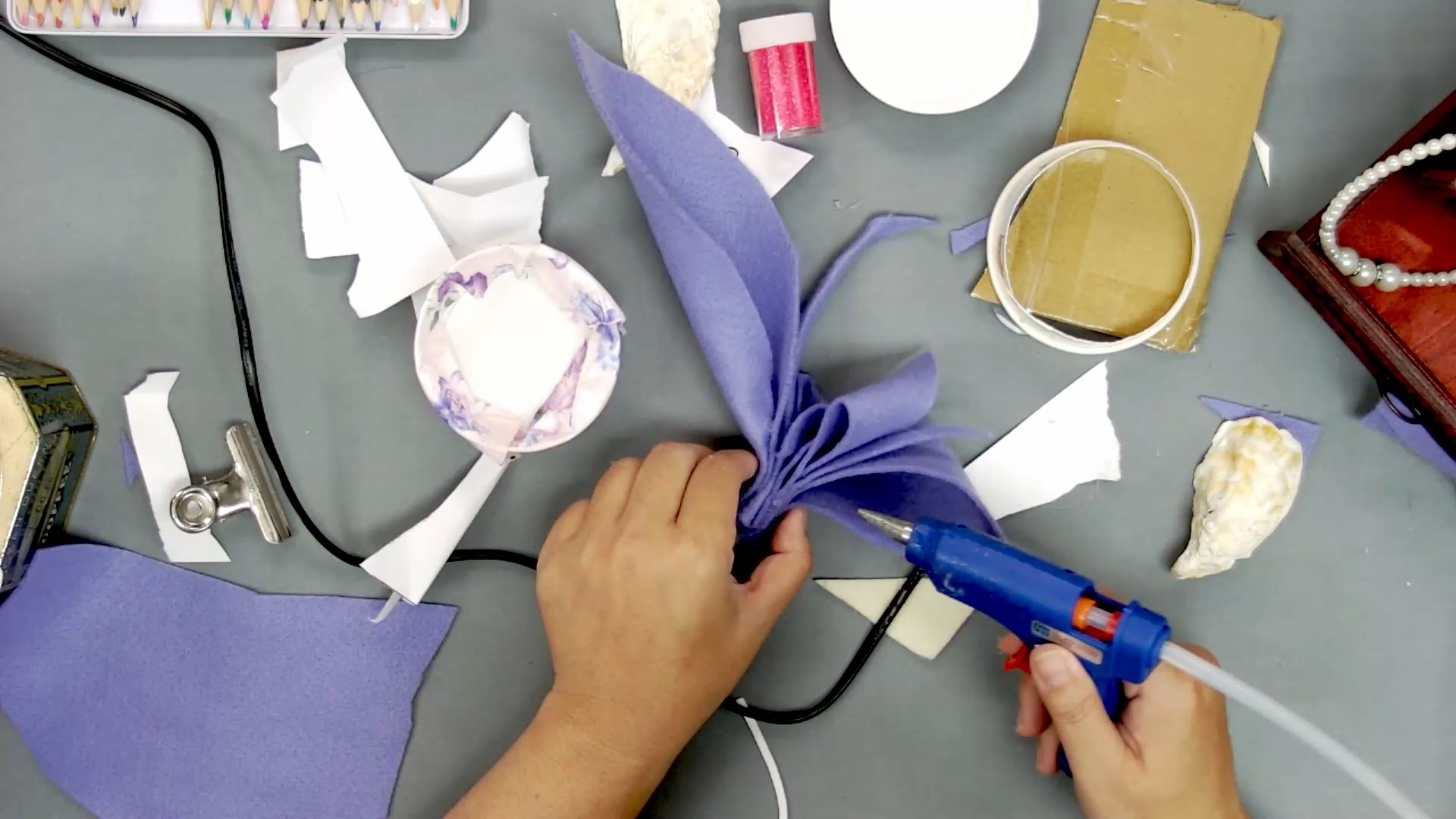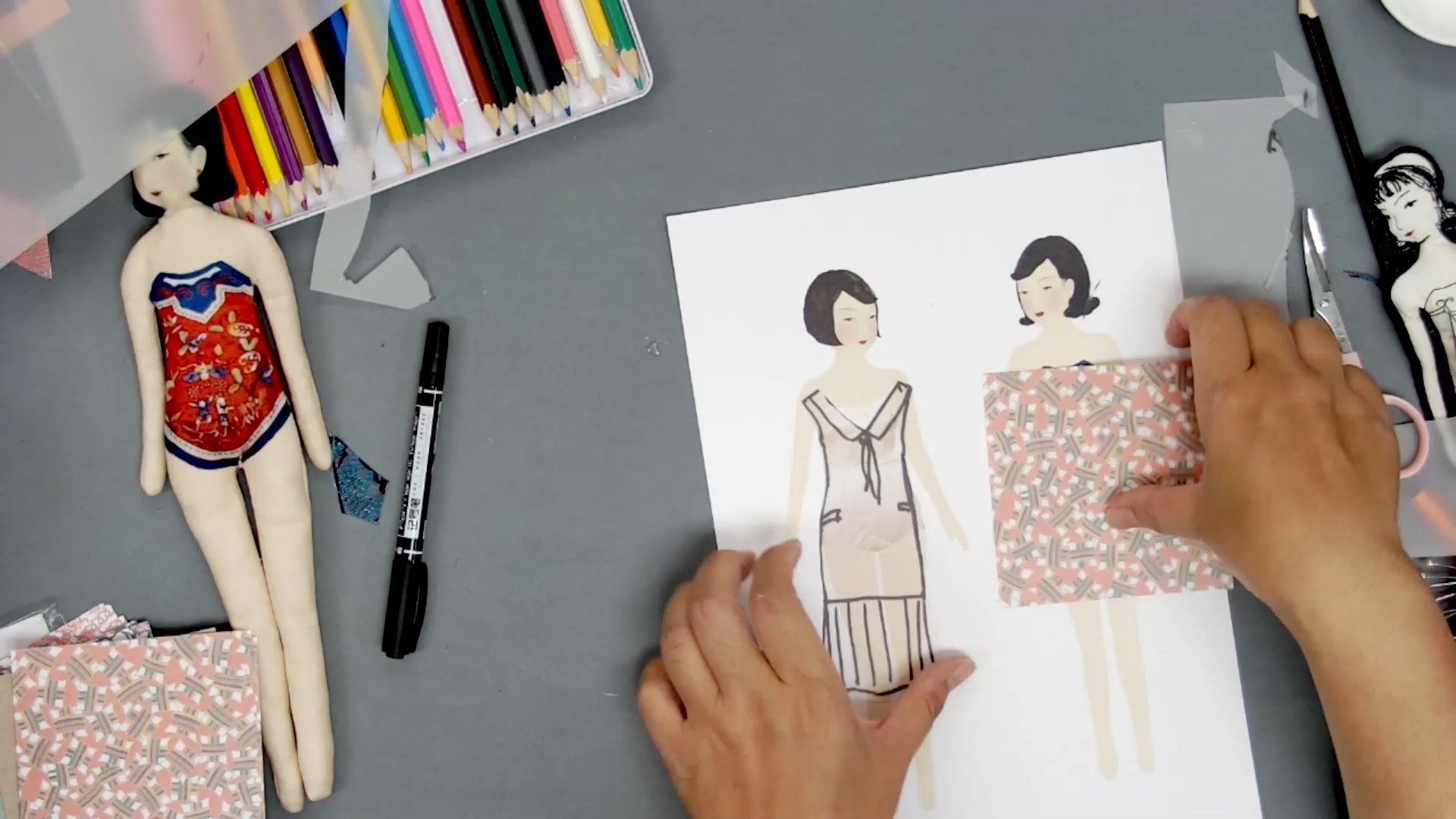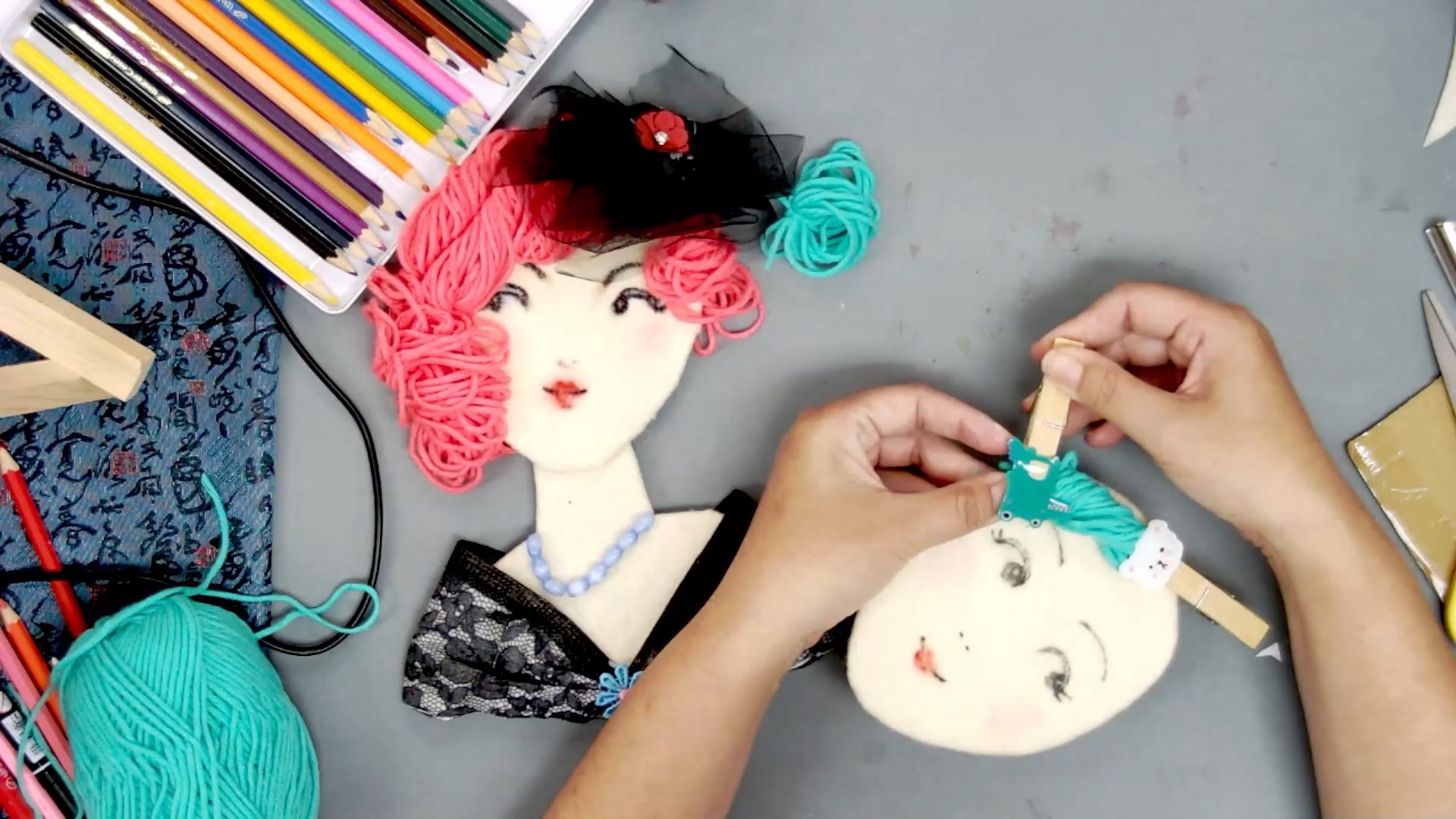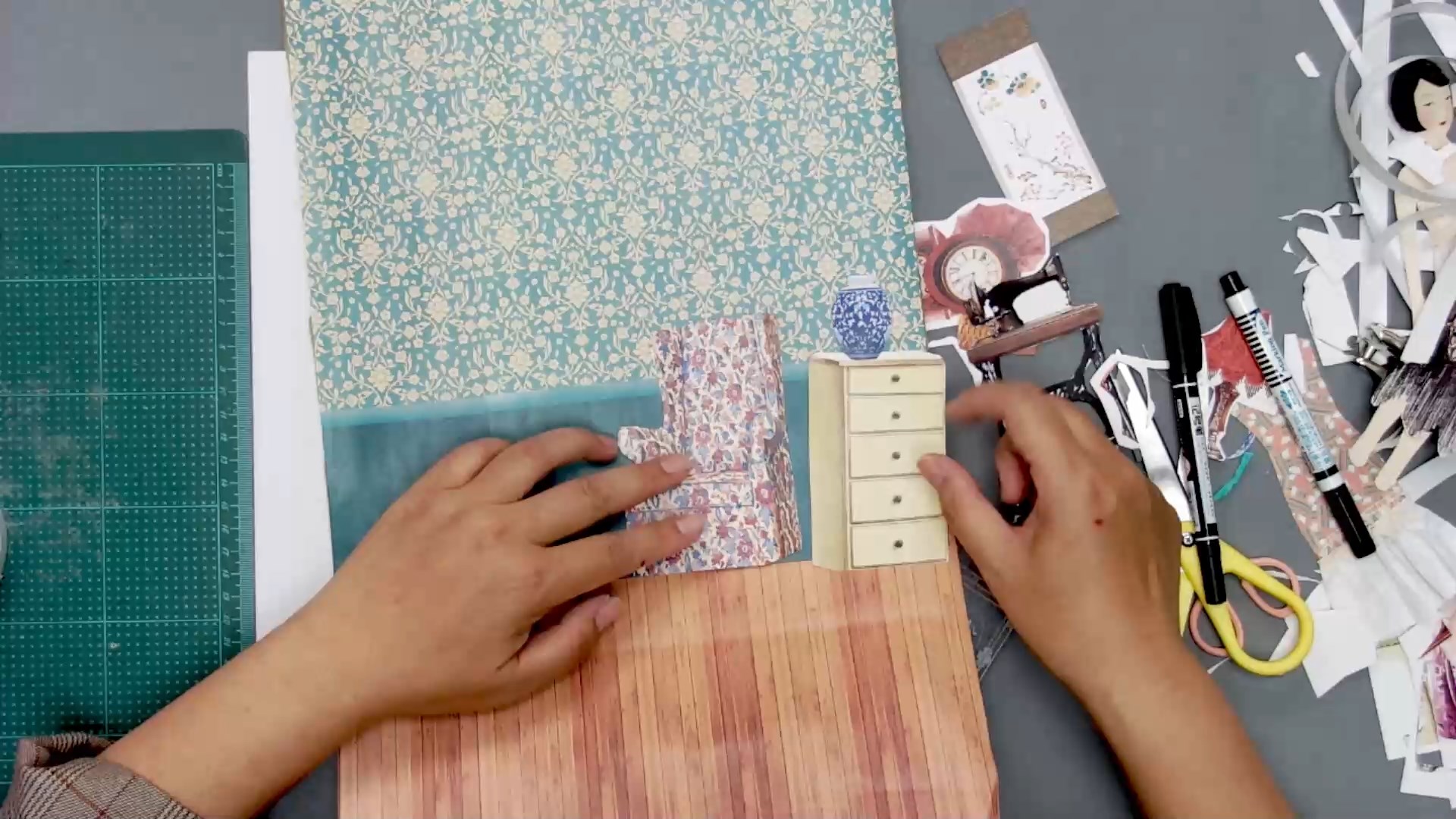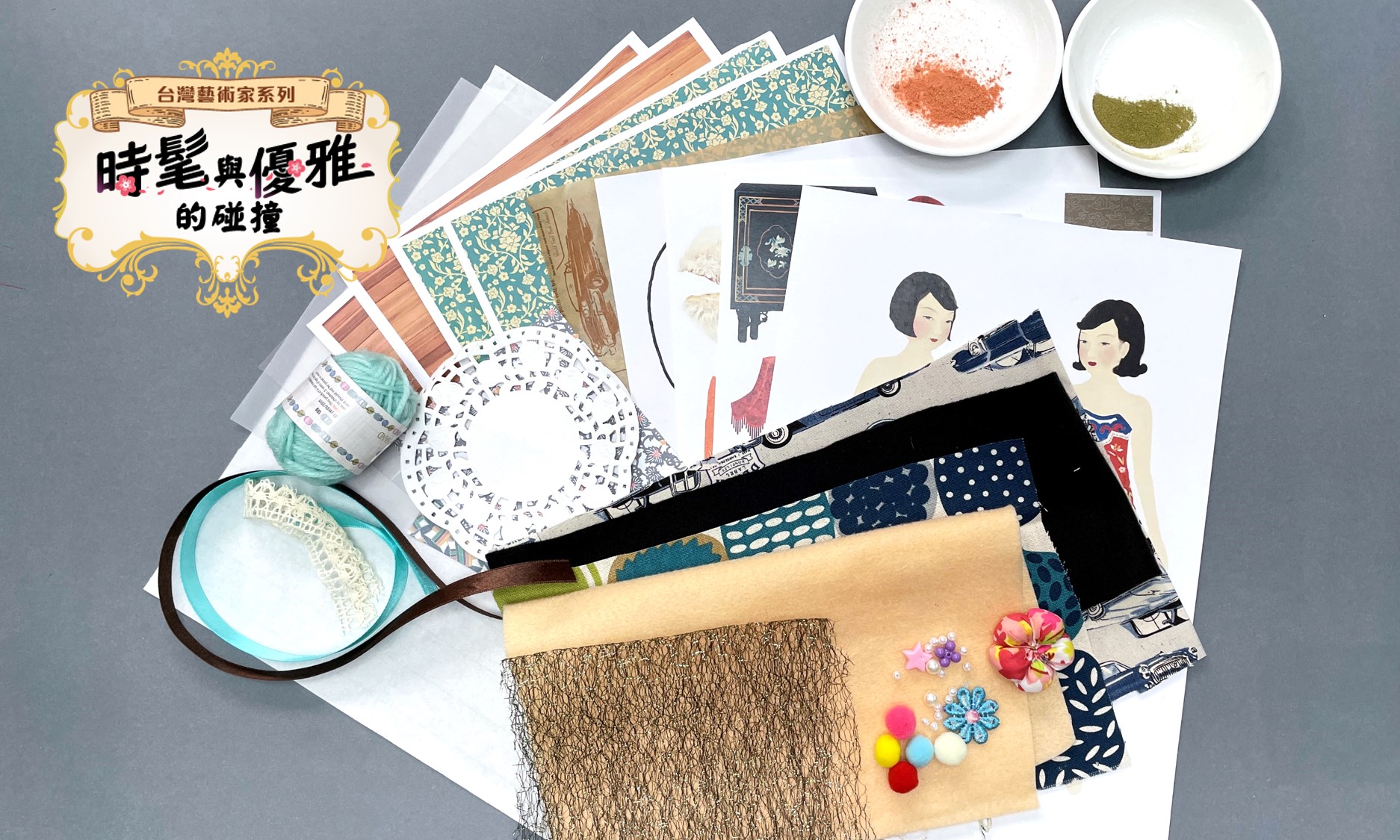 宣紙、色粉(2色隨機)、不織布、蕾絲與花布(顏色隨機)、英文紙、花紋紙、蕾絲紙、描圖紙、透明塑膠片、緞帶、裝飾小物件(款式隨機)、毛線(顏色隨機)、紙模(人物、服飾、家具)