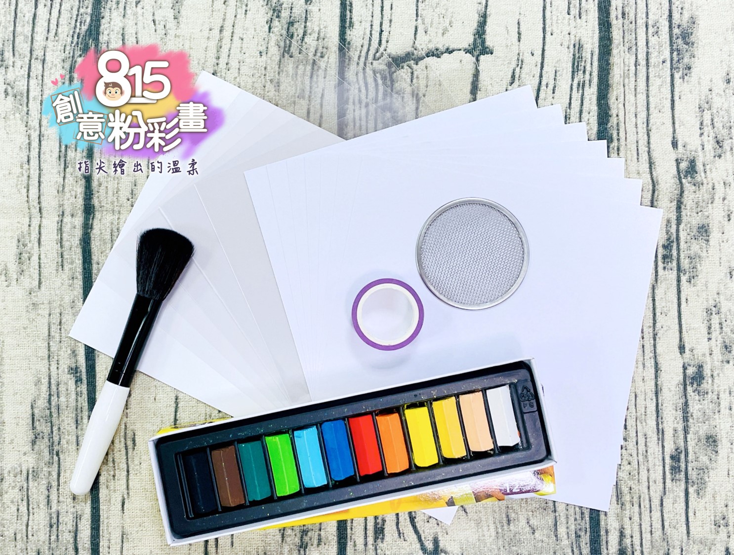 12色粉彩筆、粉彩刷、方形粉彩畫紙7張、刮網、和紙膠帶(顏色隨機)、作品保護套5張、A5厚紙卡2張(製作形板用)