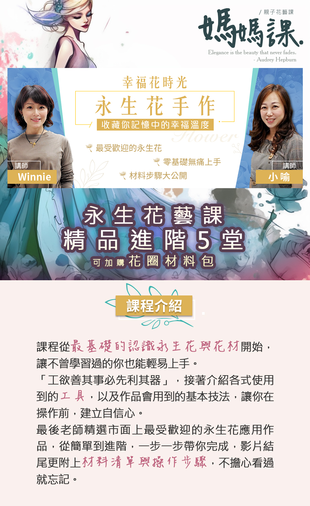 專職幼兒教育領域之餘,815聯乘優秀花藝教授獻上 #媽媽課 滿足您的花藝作品想像,我們一起最大化心中的美,課程除了老師的悉心講解,同時呈現手作的細部畫面,猶如親臨現場的教學感受,居家學習即可輕鬆體悟永生花藝技術。