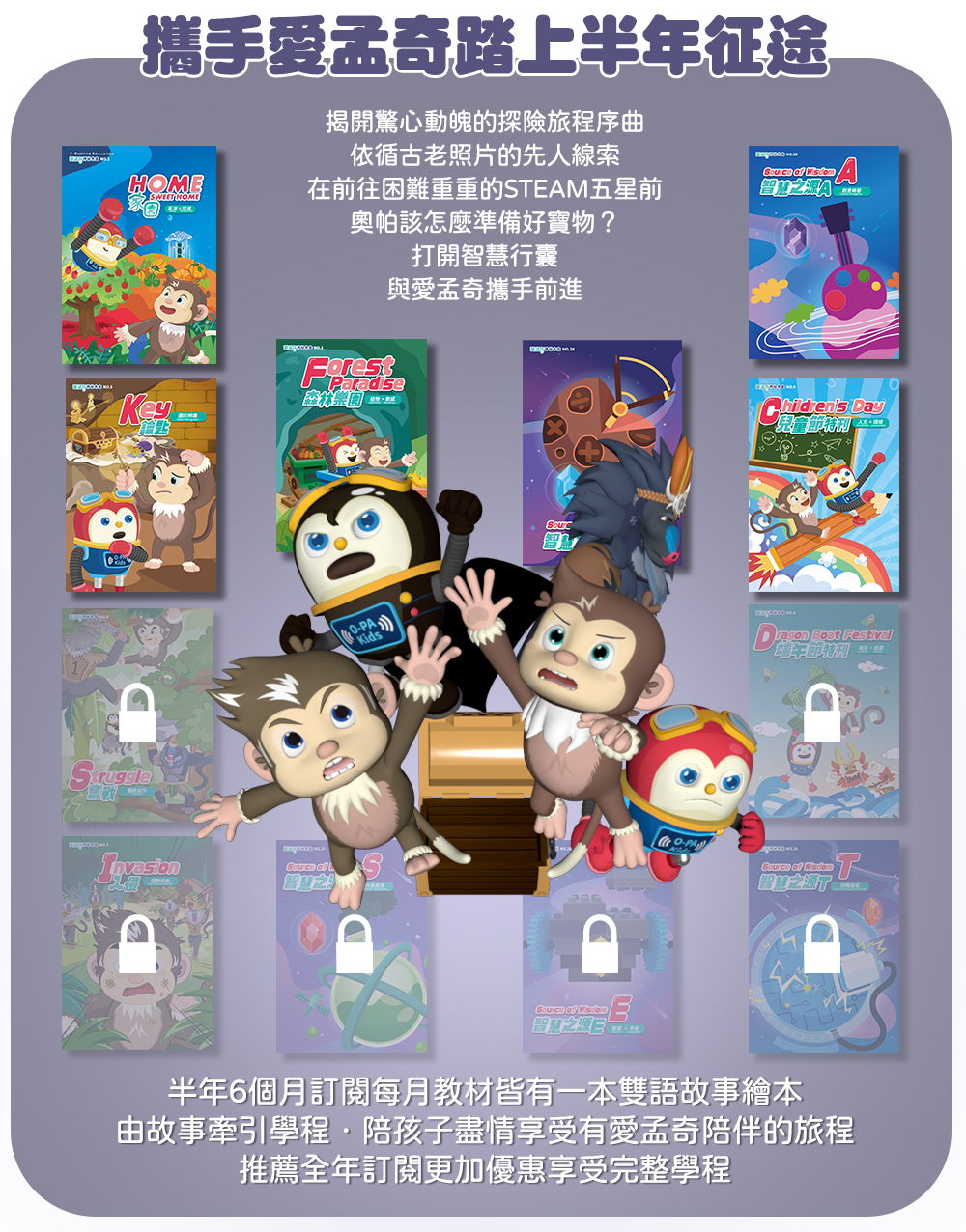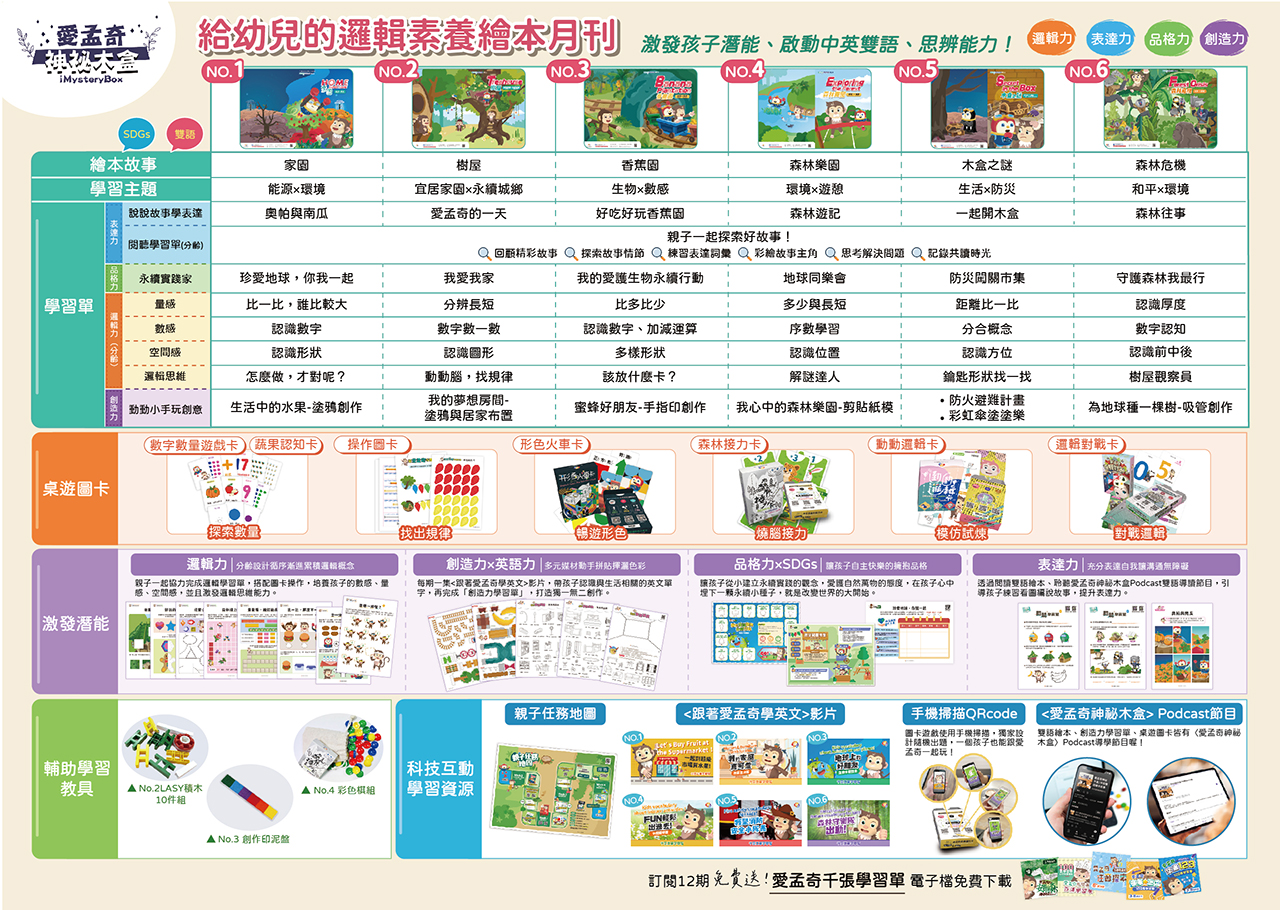 專為2-6歲幼兒量身設計的雙語繪本月刊,依據繪本故事內容,推出專屬Podcast雙語導讀節目、特製桌遊圖卡及任務學習單,透過五感學習,提升孩子的邏輯力、表達力、品格力與創造力,進而啟動思辨能力!