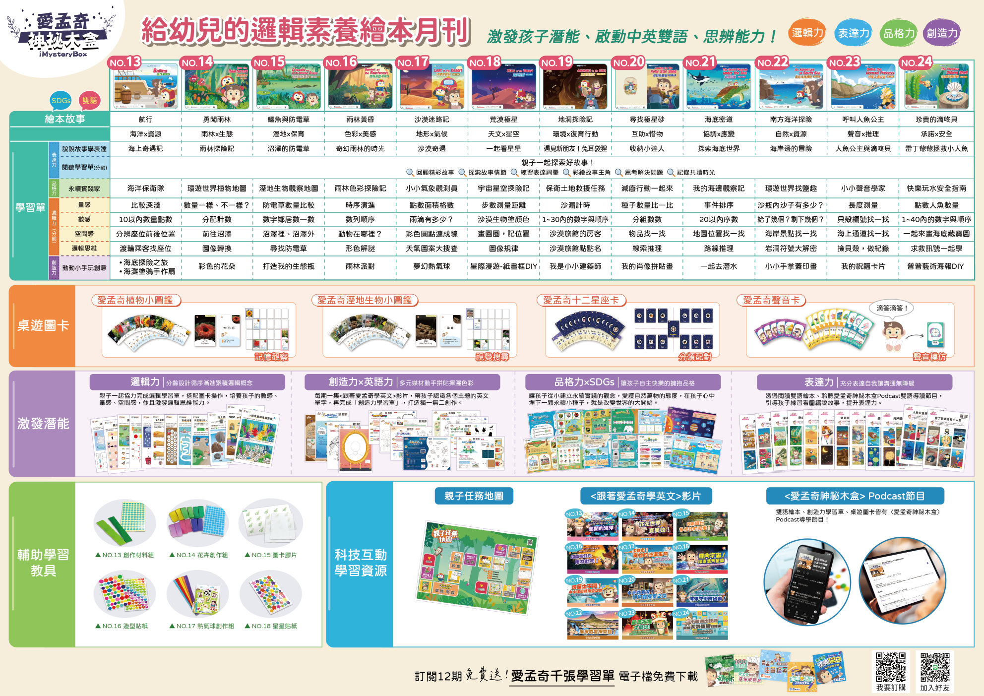 專為2-6歲幼兒量身設計的雙語繪本月刊,依據繪本故事內容,推出專屬Podcast雙語導讀節目、特製桌遊圖卡及任務學習單,透過五感學習,提升孩子的邏輯力、表達力、品格力與創造力,進而啟動思辨能力!