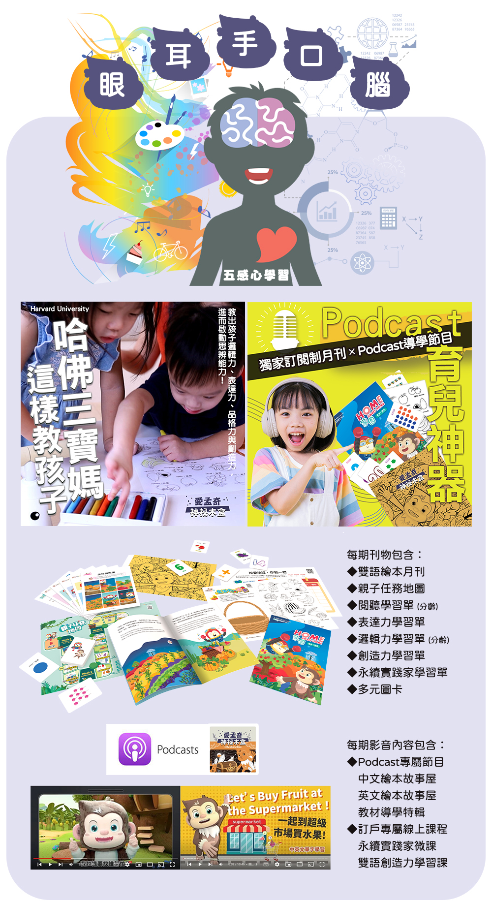 專為2-6歲幼兒量身設計的雙語繪本月刊,依據繪本故事內容,推出專屬Podcast雙語導讀節目、特製桌遊圖卡及任務學習單,透過五感學習,提升孩子的邏輯力、表達力、品格力與創造力,進而啟動思辨能力!