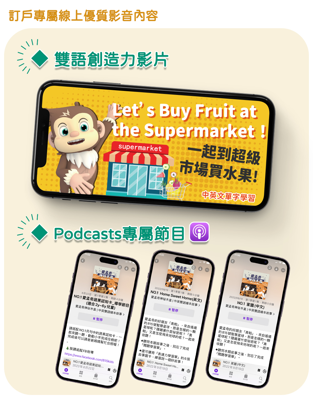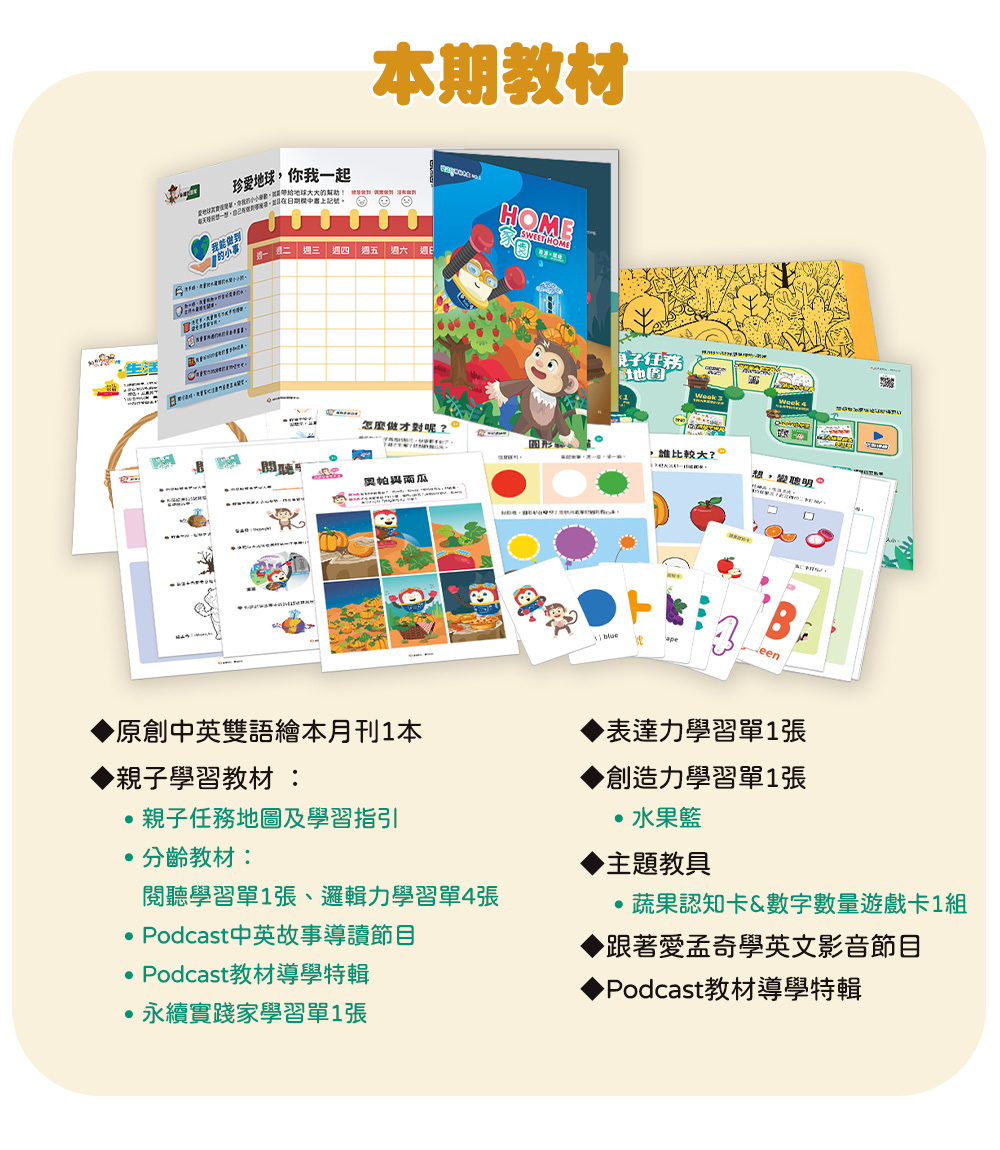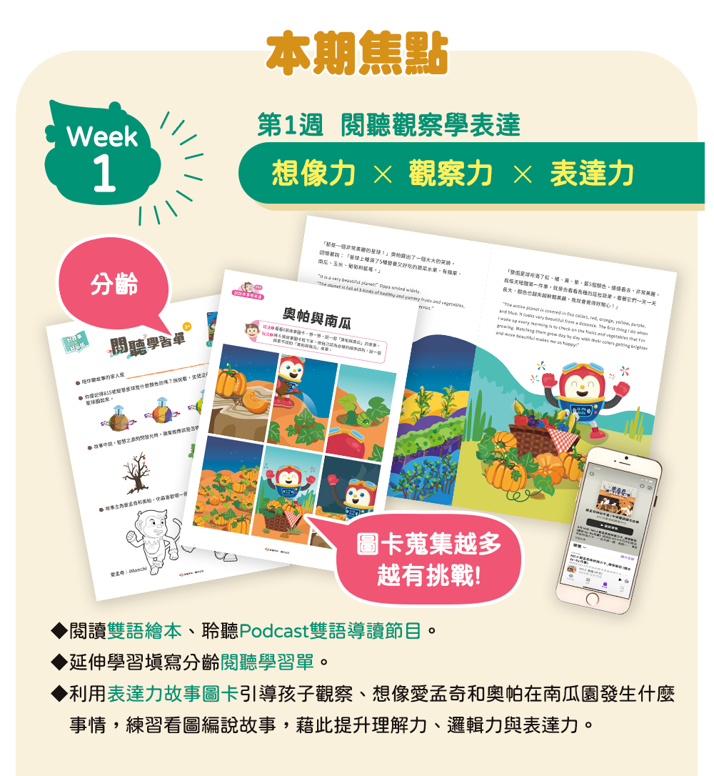 專為2-6歲幼兒量身設計的雙語繪本月刊,依據繪本故事內容,推出專屬Podcast雙語導讀節目、特製桌遊圖卡及任務學習單,透過五感學習,提升孩子的邏輯力、表達力、品格力與創造力,進而啟動思辨能力!