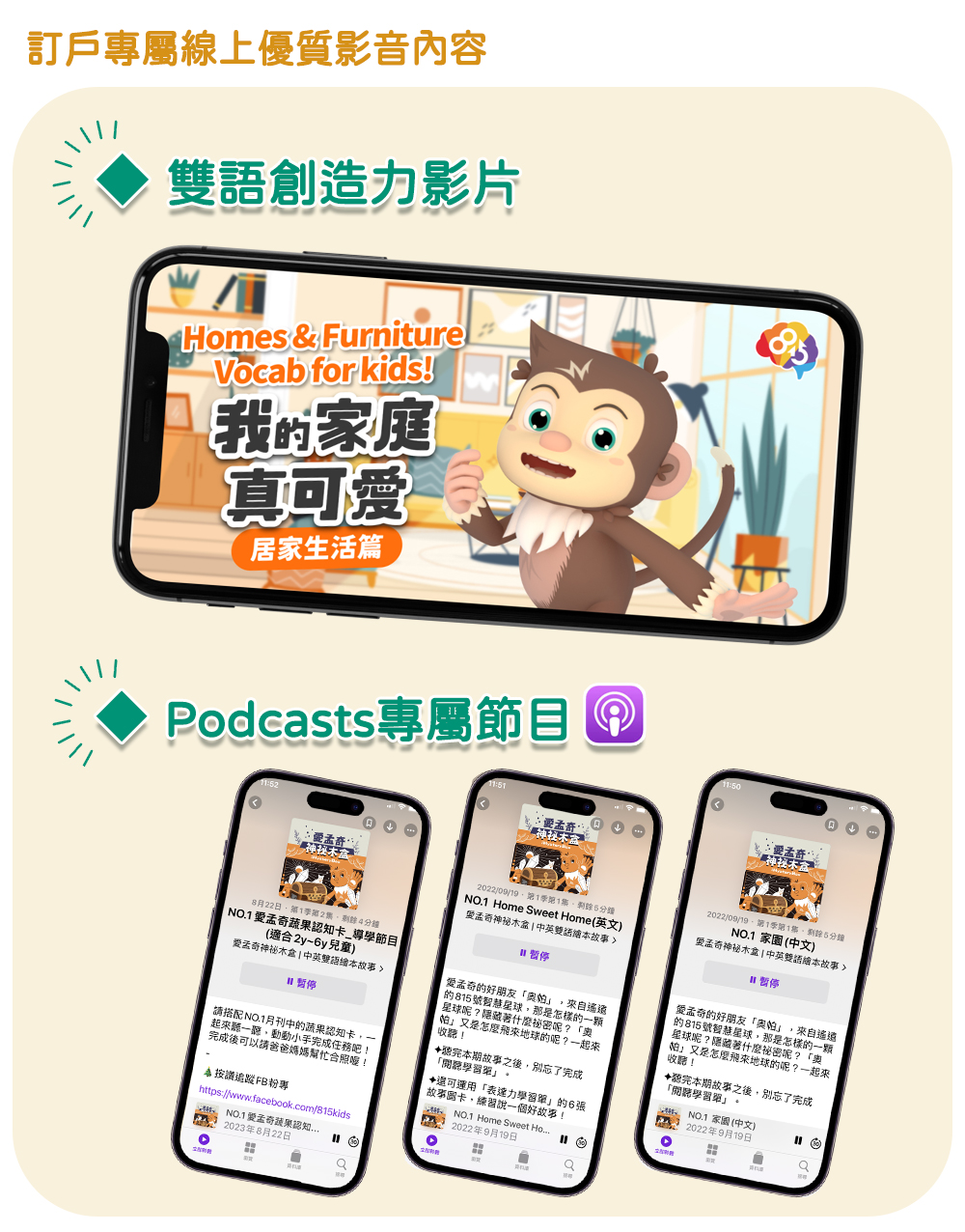 專為2-6歲幼兒量身設計的雙語繪本月刊,依據繪本故事內容,推出專屬Podcast雙語導讀節目、特製桌遊圖卡及任務學習單,透過五感學習,提升孩子的邏輯力、表達力、品格力與創造力,進而啟動思辨能力!