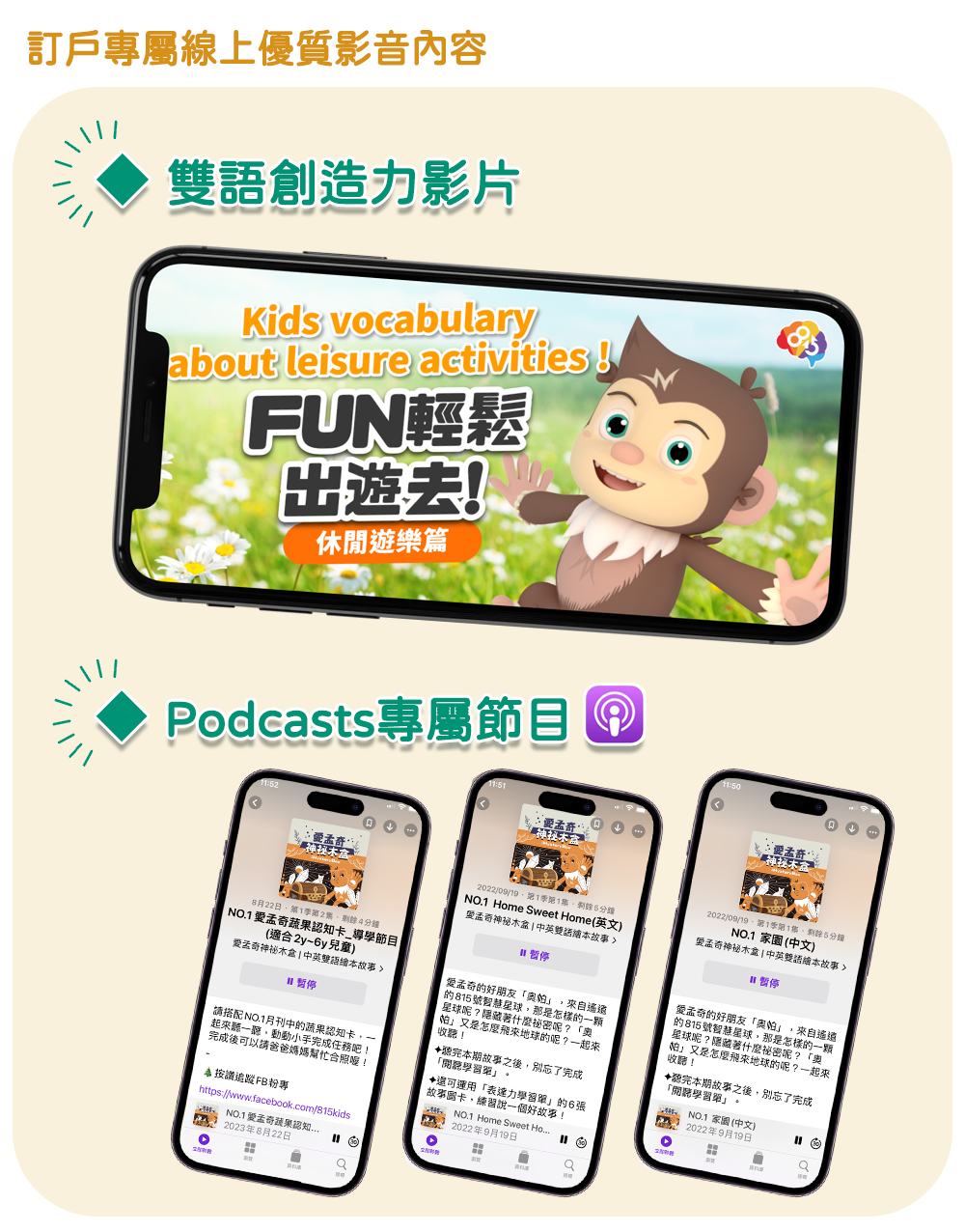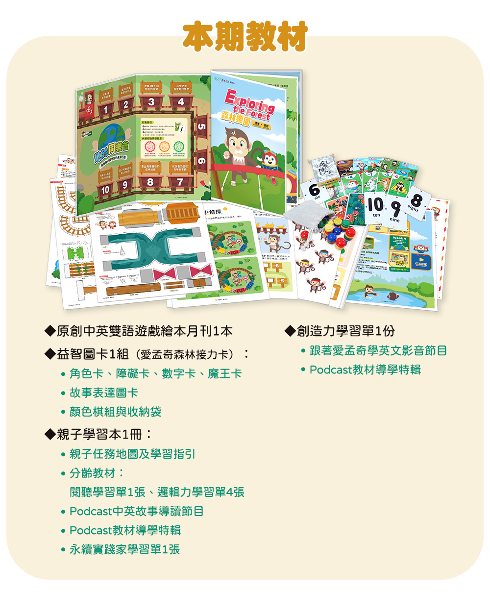 專為2-6歲幼兒量身設計的雙語繪本月刊,依據繪本故事內容,推出專屬Podcast雙語導讀節目、特製桌遊圖卡及任務學習單,透過五感學習,提升孩子的邏輯力、表達力、品格力與創造力,進而啟動思辨能力!