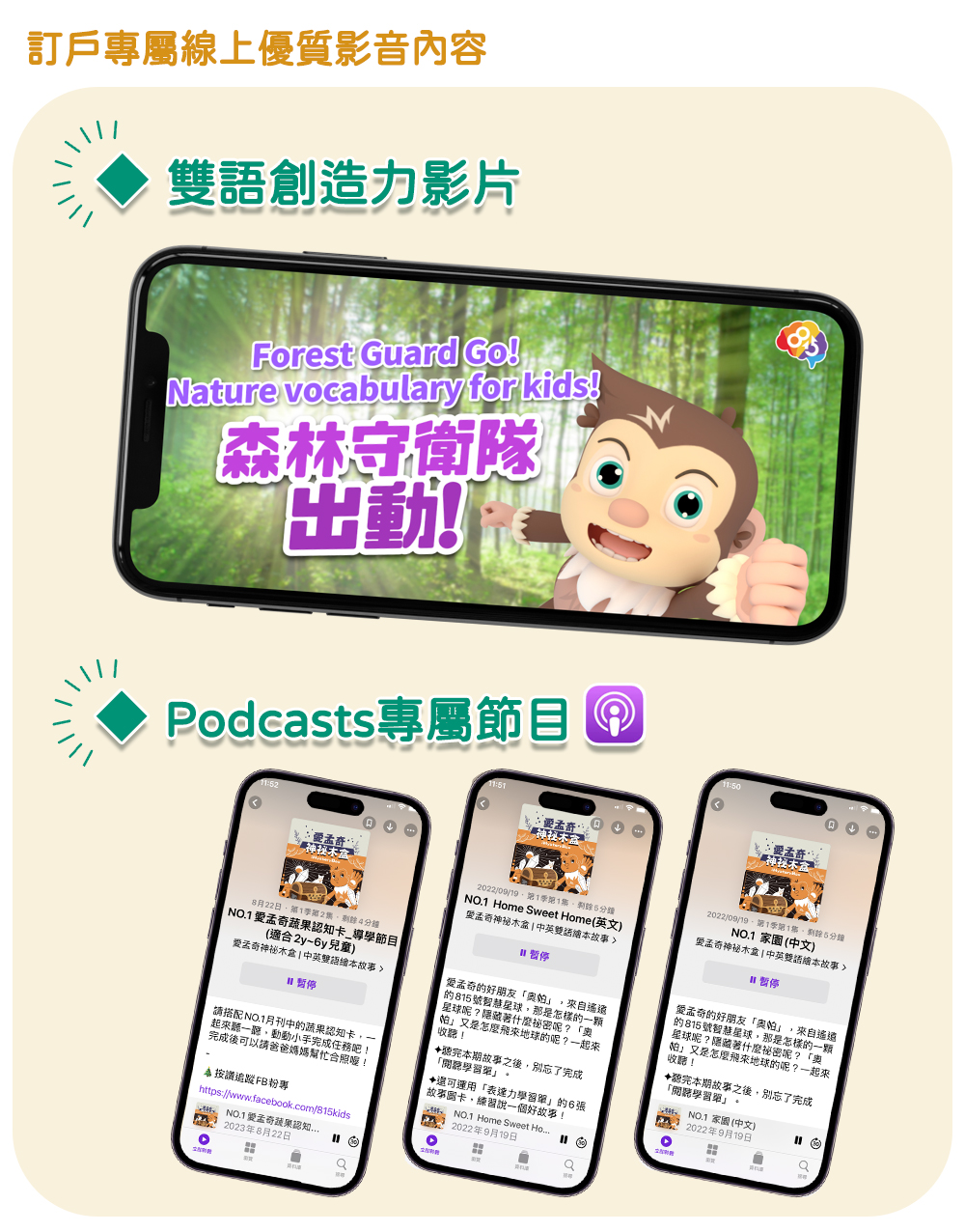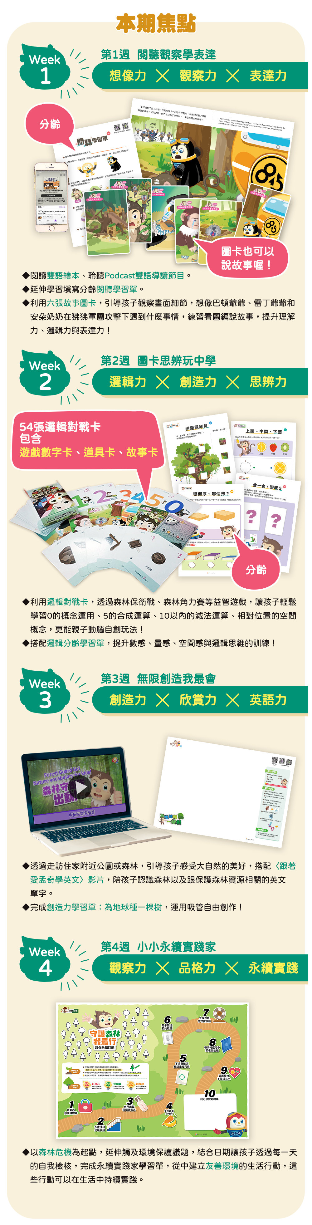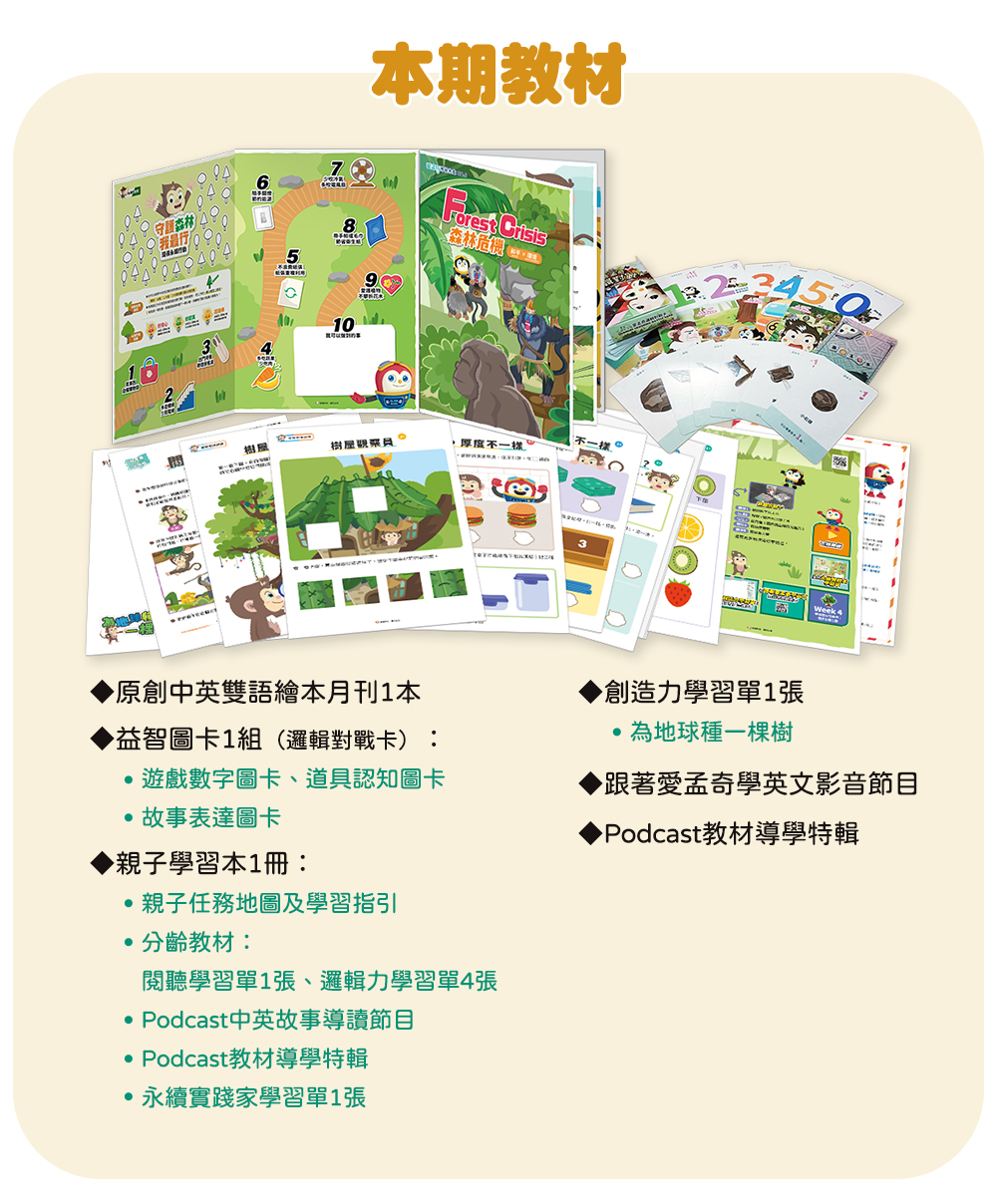 專為2-6歲幼兒量身設計的雙語繪本月刊,依據繪本故事內容,推出專屬Podcast雙語導讀節目、特製桌遊圖卡及任務學習單,透過五感學習,提升孩子的邏輯力、表達力、品格力與創造力,進而啟動思辨能力!