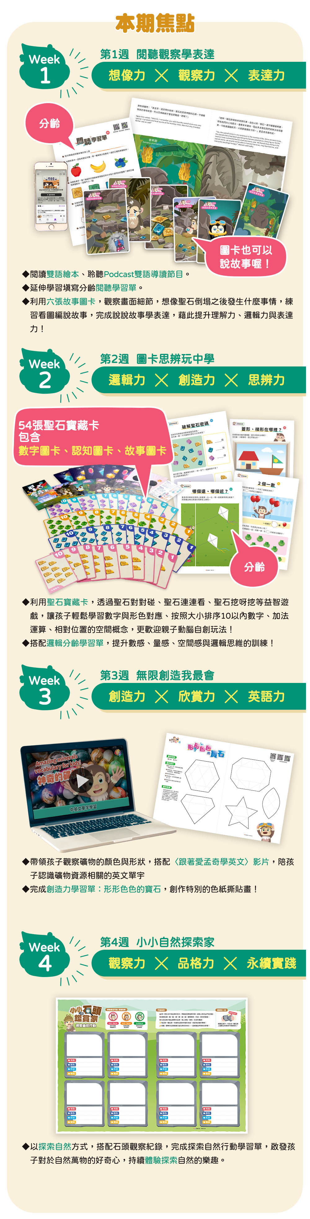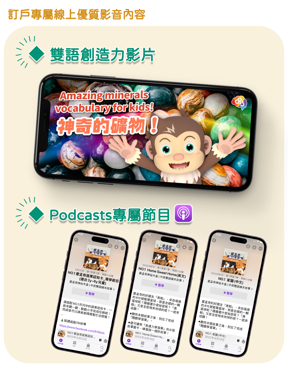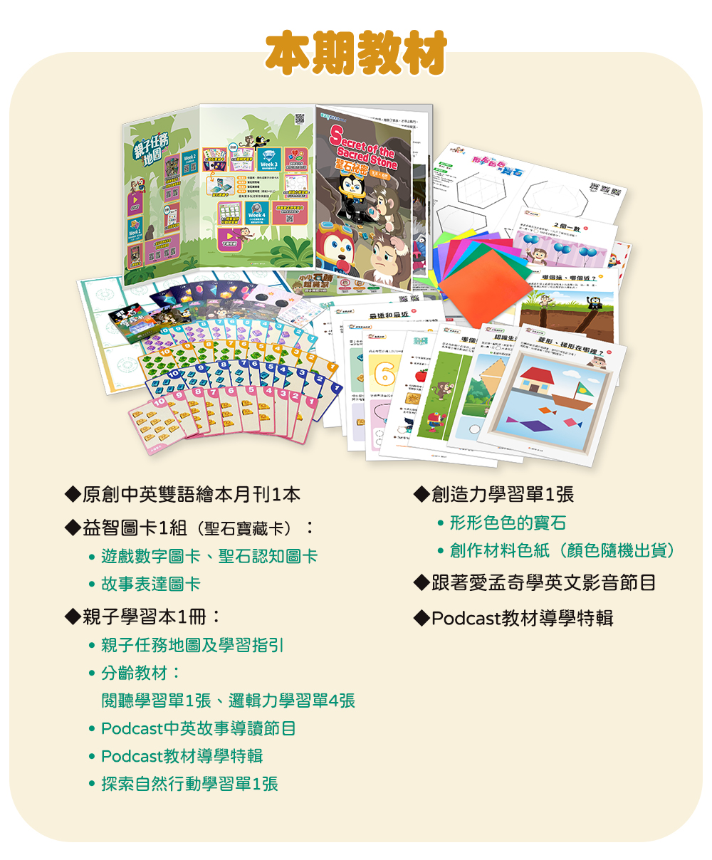 專為2-6歲幼兒量身設計的雙語繪本月刊,依據繪本故事內容,推出專屬Podcast雙語導讀節目、特製桌遊圖卡及任務學習單,透過五感學習,提升孩子的邏輯力、表達力、品格力與創造力,進而啟動思辨能力!