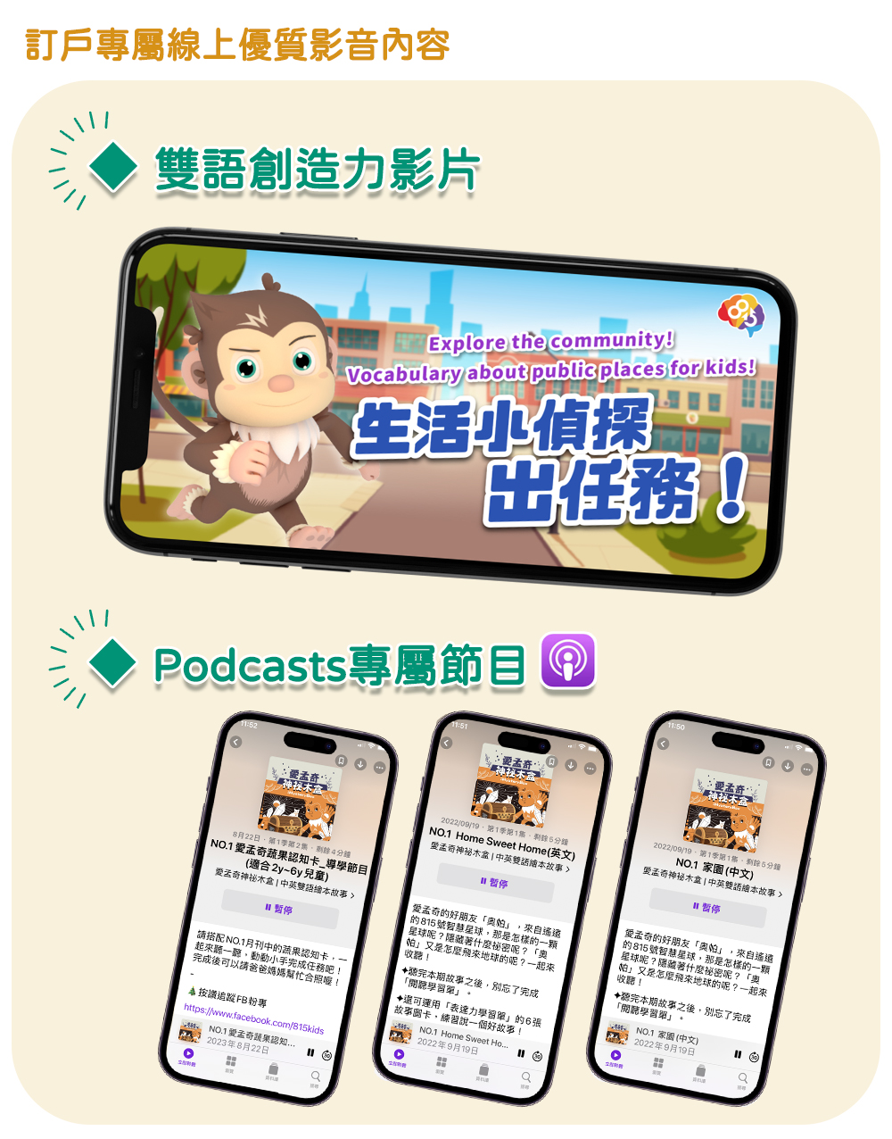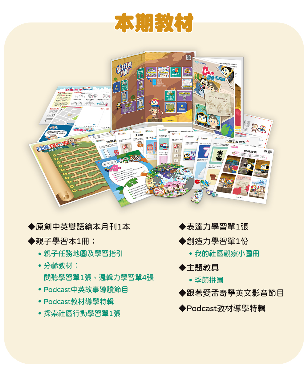 專為2-6歲幼兒量身設計的雙語繪本月刊,依據繪本故事內容,推出專屬Podcast雙語導讀節目、特製桌遊圖卡及任務學習單,透過五感學習,提升孩子的邏輯力、表達力、品格力與創造力,進而啟動思辨能力!