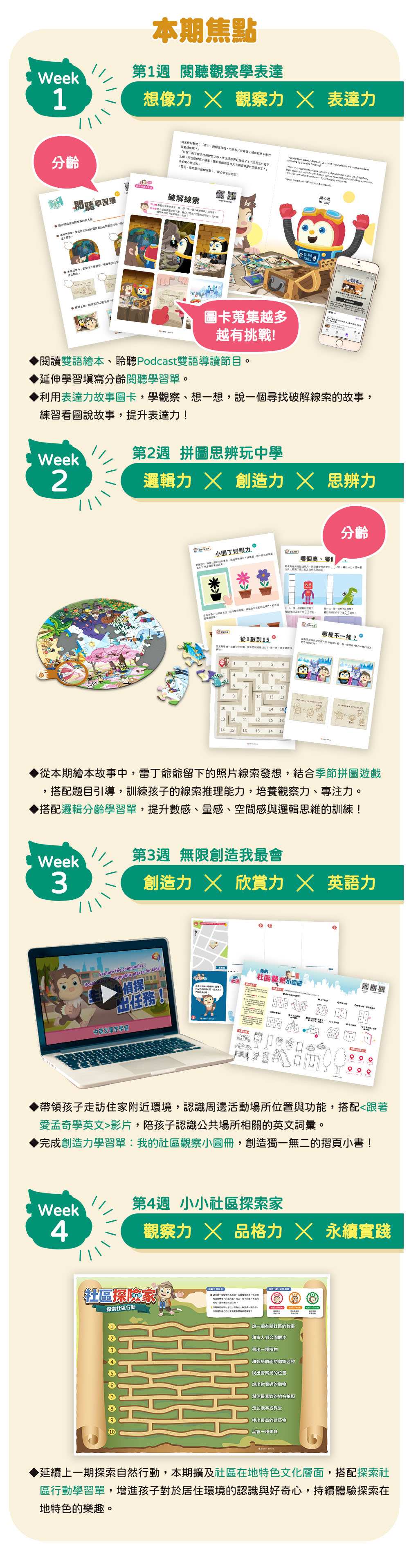 ✦分齡教材:閱聽學習單1張、邏輯力學習單4張