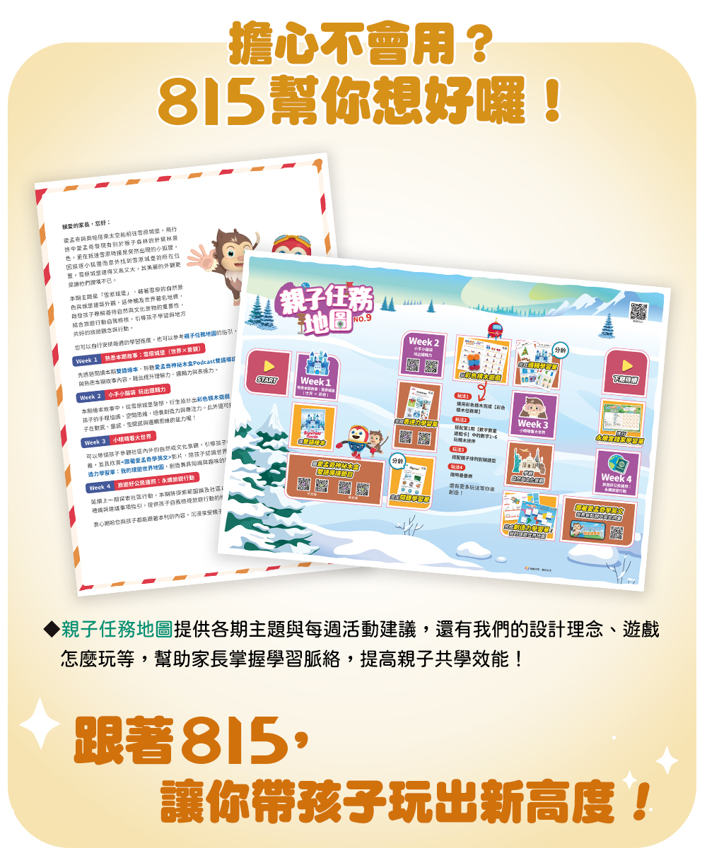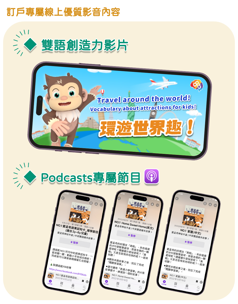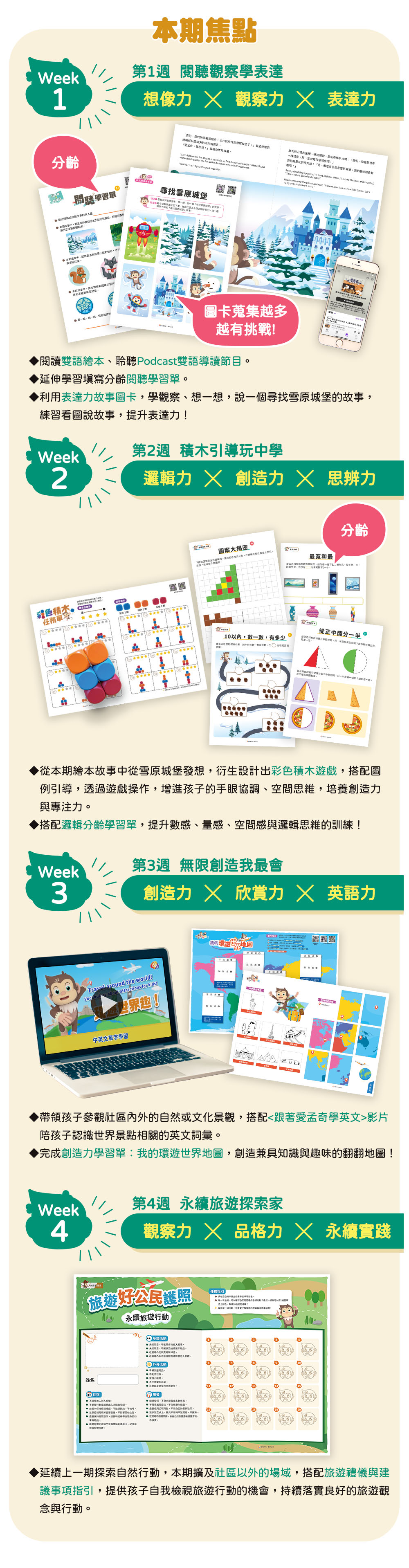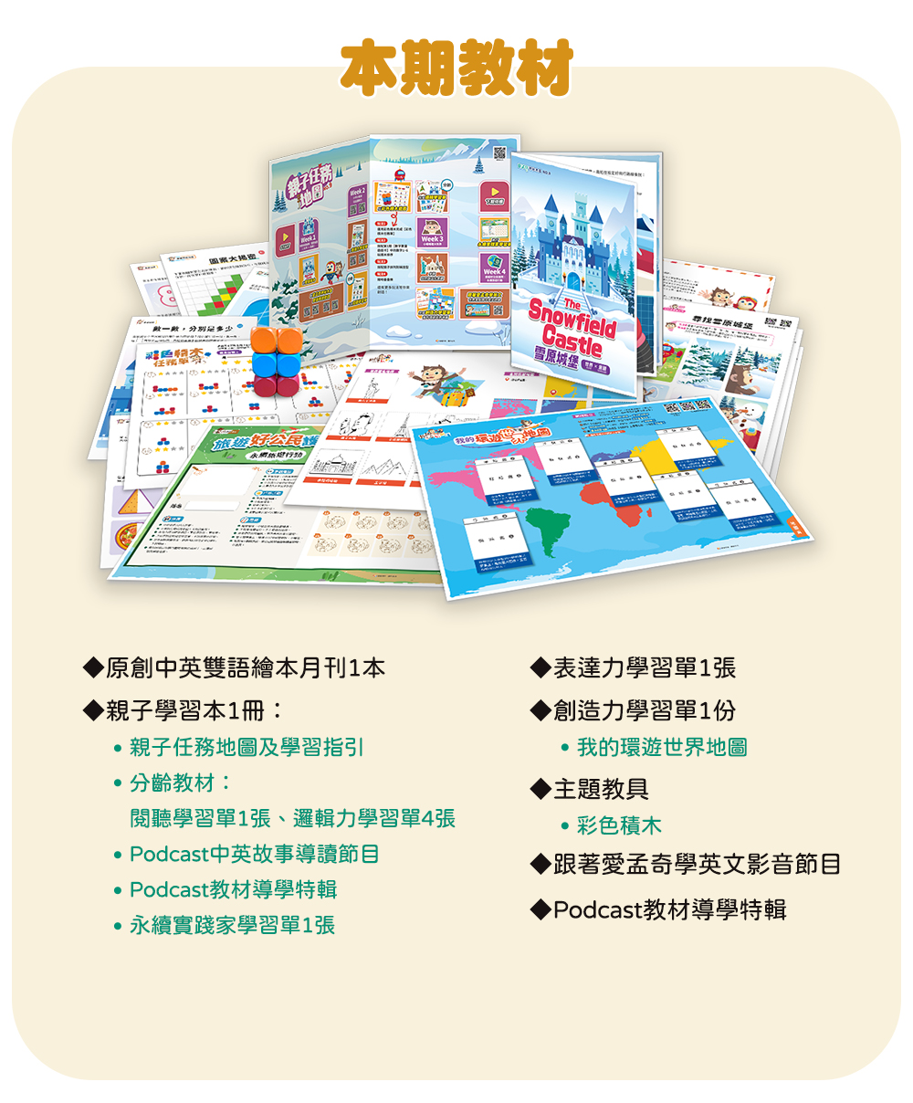 專為2-6歲幼兒量身設計的雙語繪本月刊,依據繪本故事內容,推出專屬Podcast雙語導讀節目、特製桌遊圖卡及任務學習單,透過五感學習,提升孩子的邏輯力、表達力、品格力與創造力,進而啟動思辨能力!