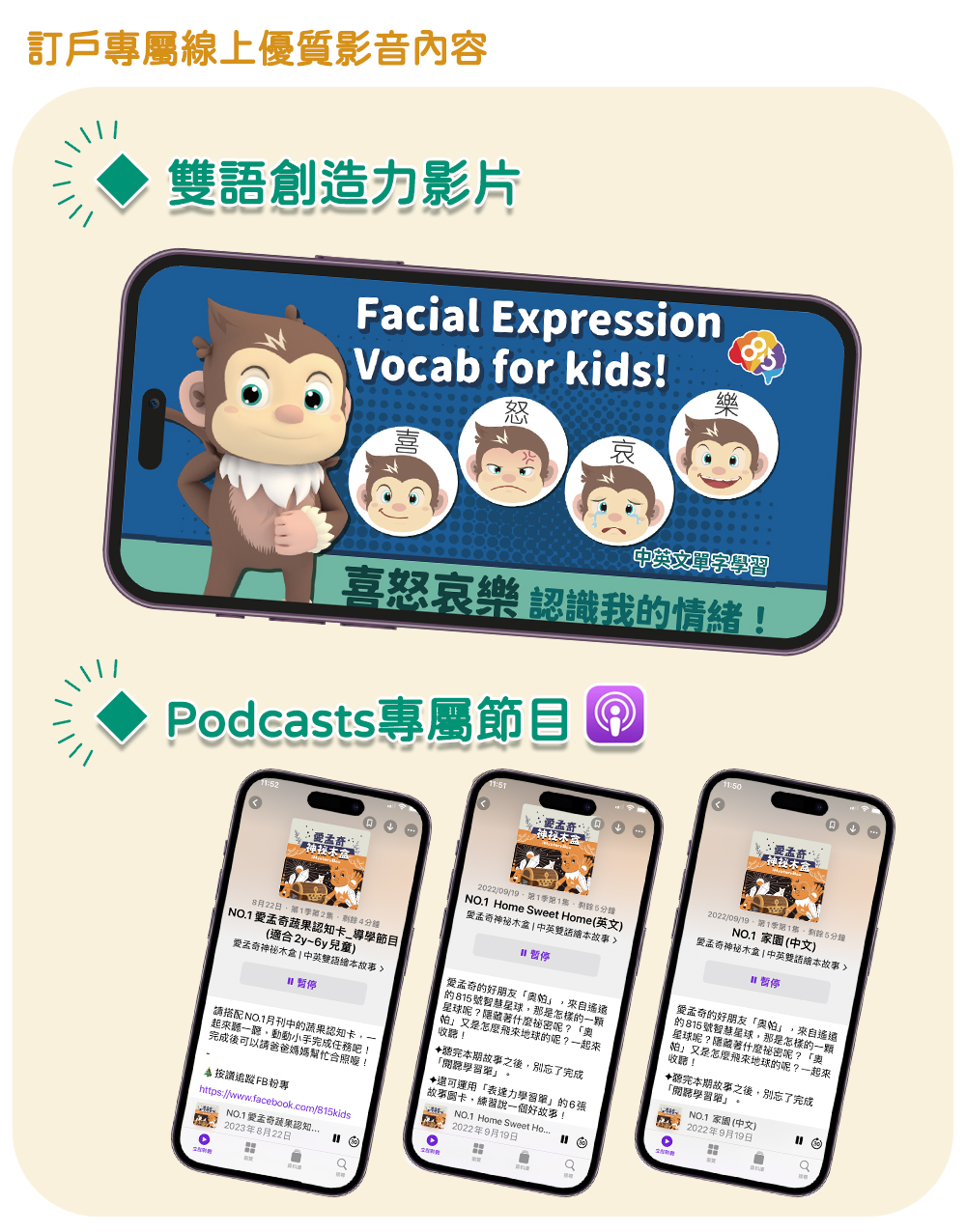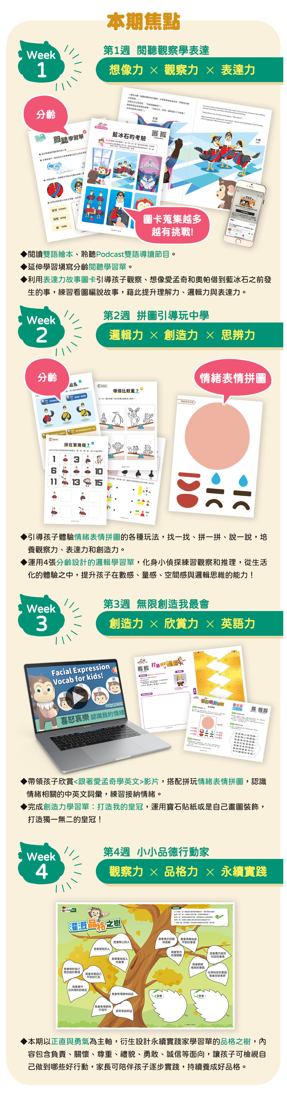 專為2-6歲幼兒量身設計的雙語繪本月刊,依據繪本故事內容,推出專屬Podcast雙語導讀節目、特製桌遊圖卡及任務學習單,透過五感學習,提升孩子的邏輯力、表達力、品格力與創造力,進而啟動思辨能力!