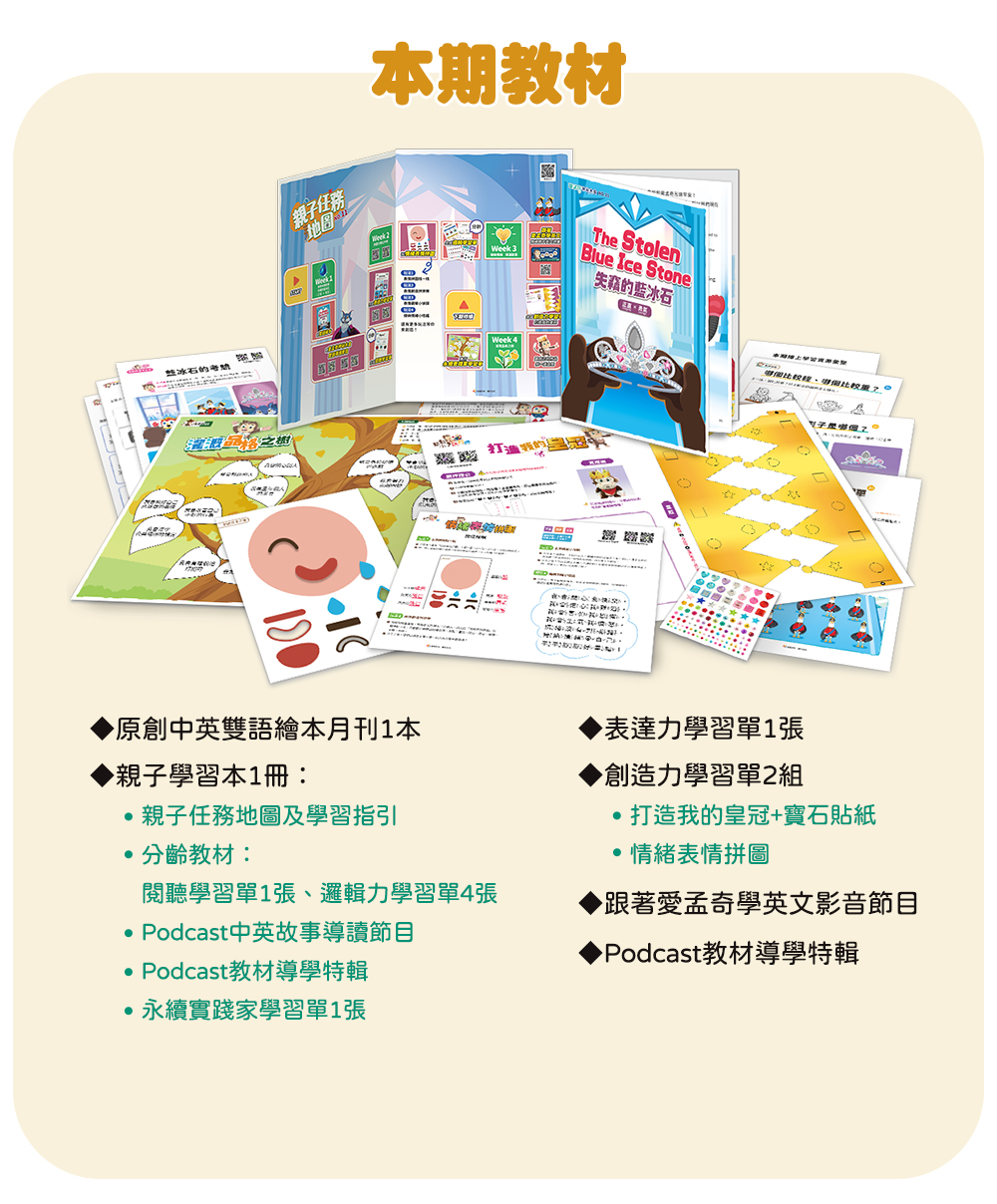 本期主題是「失竊的藍冰石」,借鏡主角們的反應與行動,引導孩子積極面對困難的心態,包含線索推理、觀察情緒、養成品格等學習內容,適合親子共同解題,增進認知能力之外,也能觸及認識自我與關懷他人的情意學習。