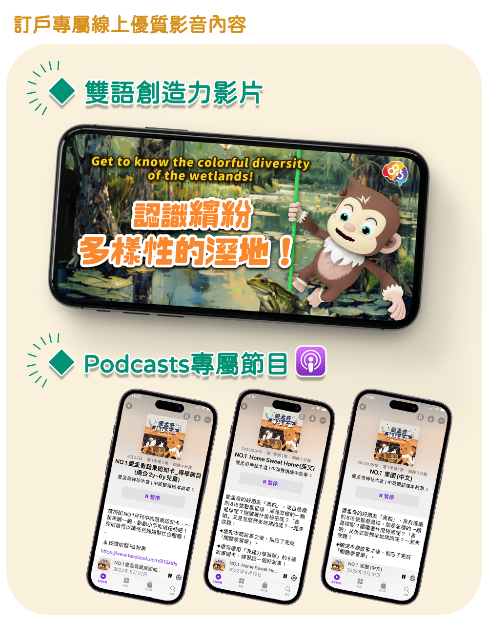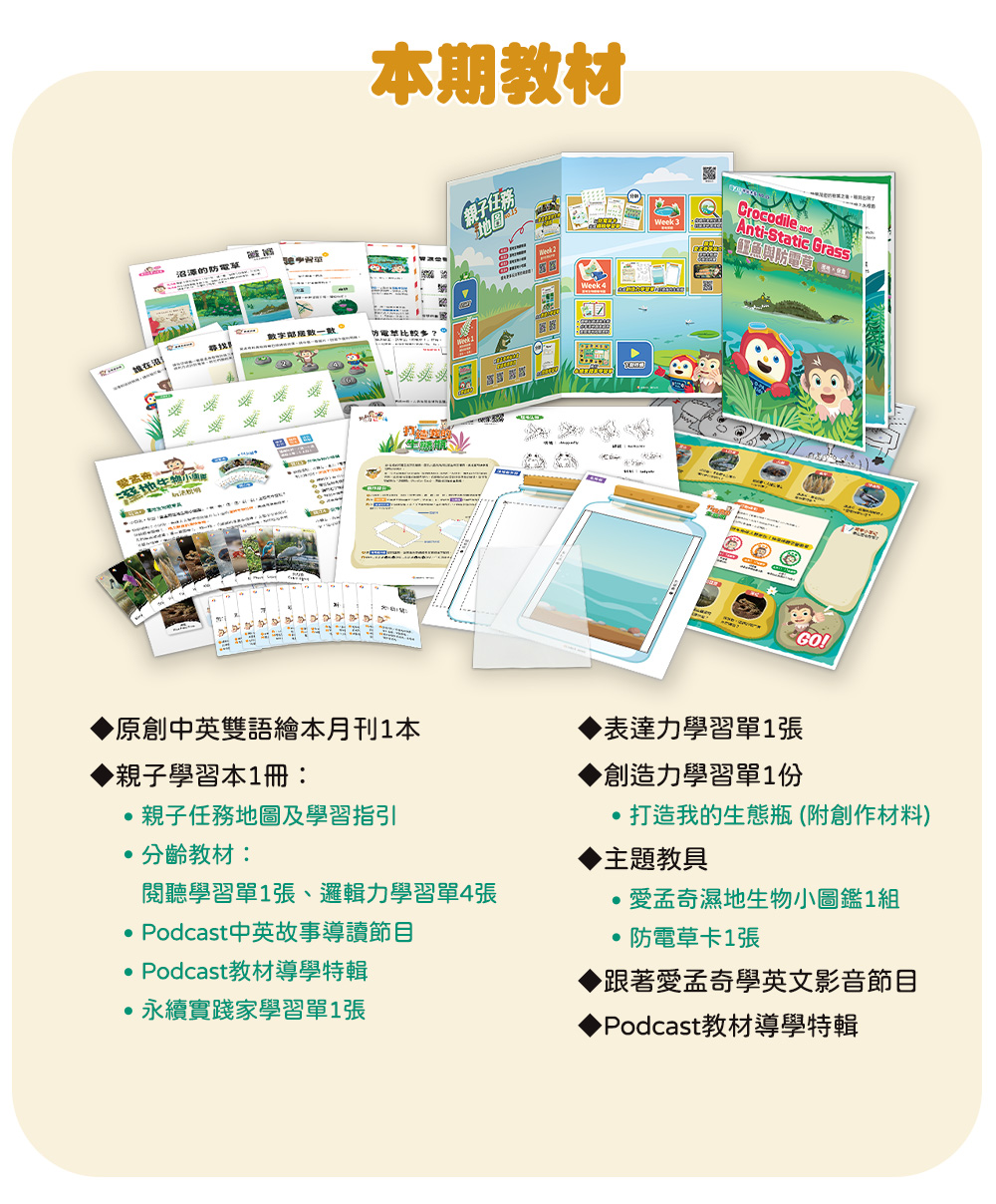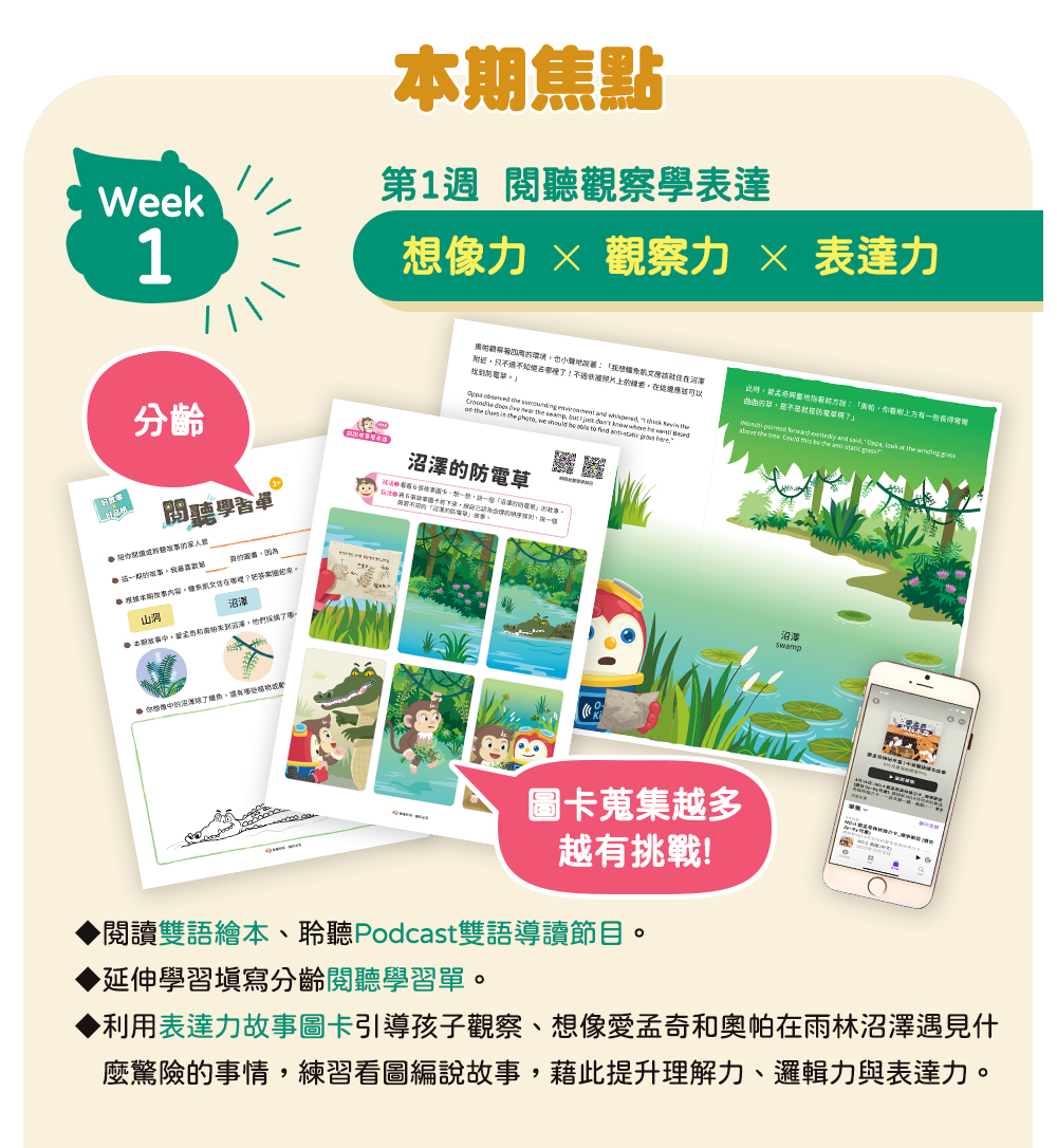 專為2-6歲幼兒量身設計的雙語繪本月刊,依據繪本故事內容,推出專屬Podcast雙語導讀節目、特製桌遊圖卡及任務學習單,透過五感學習,提升孩子的邏輯力、表達力、品格力與創造力,進而啟動思辨能力!