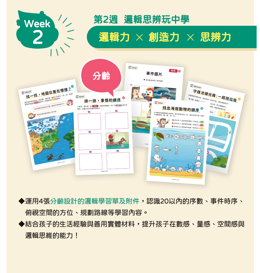 ✦分齡教材:閱聽學習單1張、邏輯力學習單4張