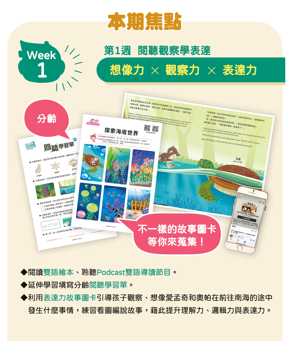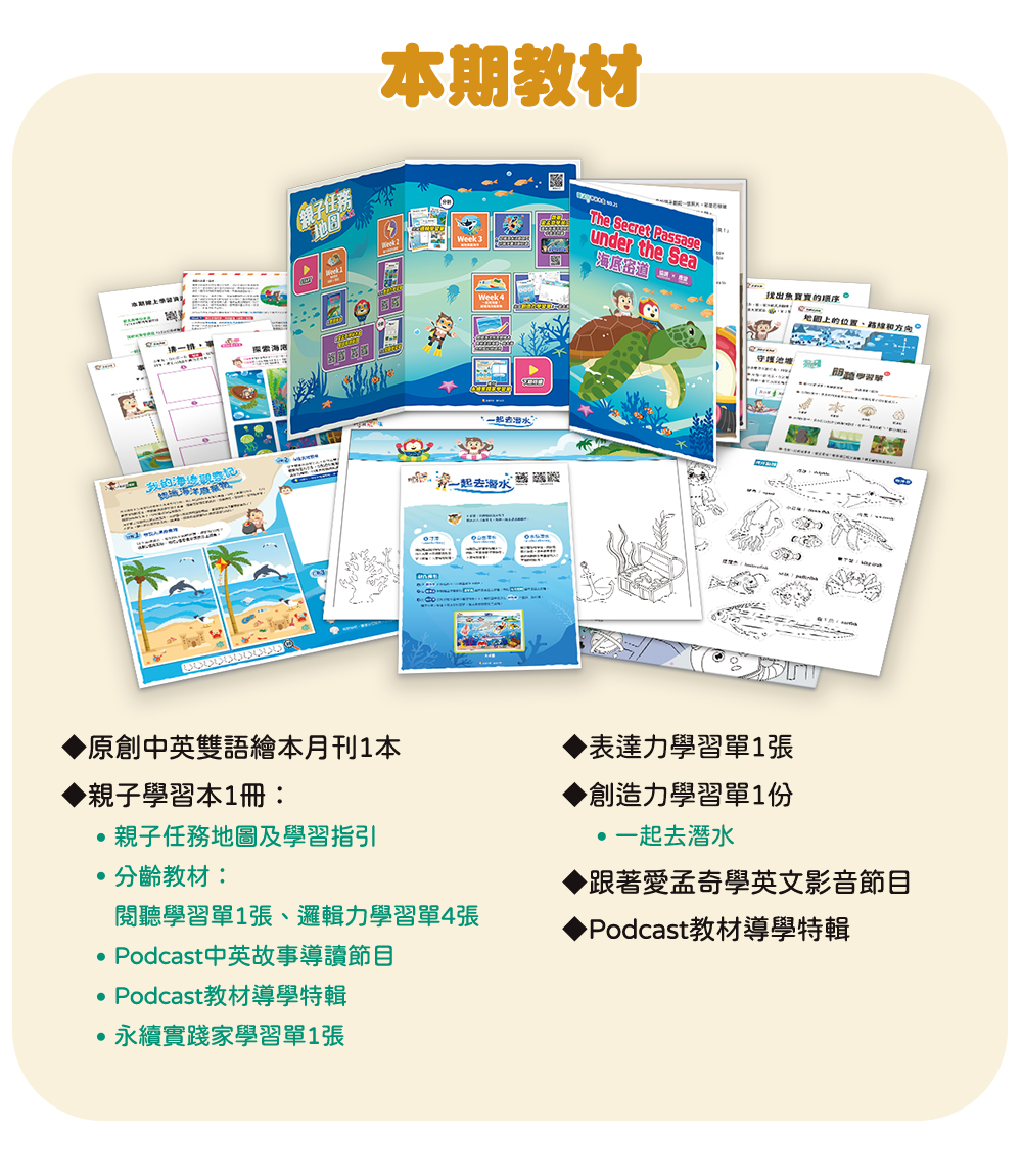 專為2-6歲幼兒量身設計的雙語繪本月刊,依據繪本故事內容,推出專屬Podcast雙語導讀節目、特製桌遊圖卡及任務學習單,透過五感學習,提升孩子的邏輯力、表達力、品格力與創造力,進而啟動思辨能力!