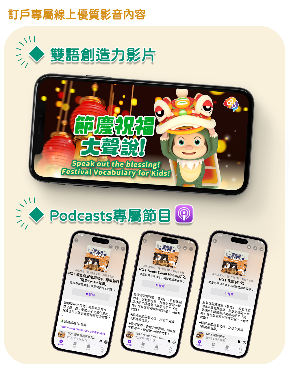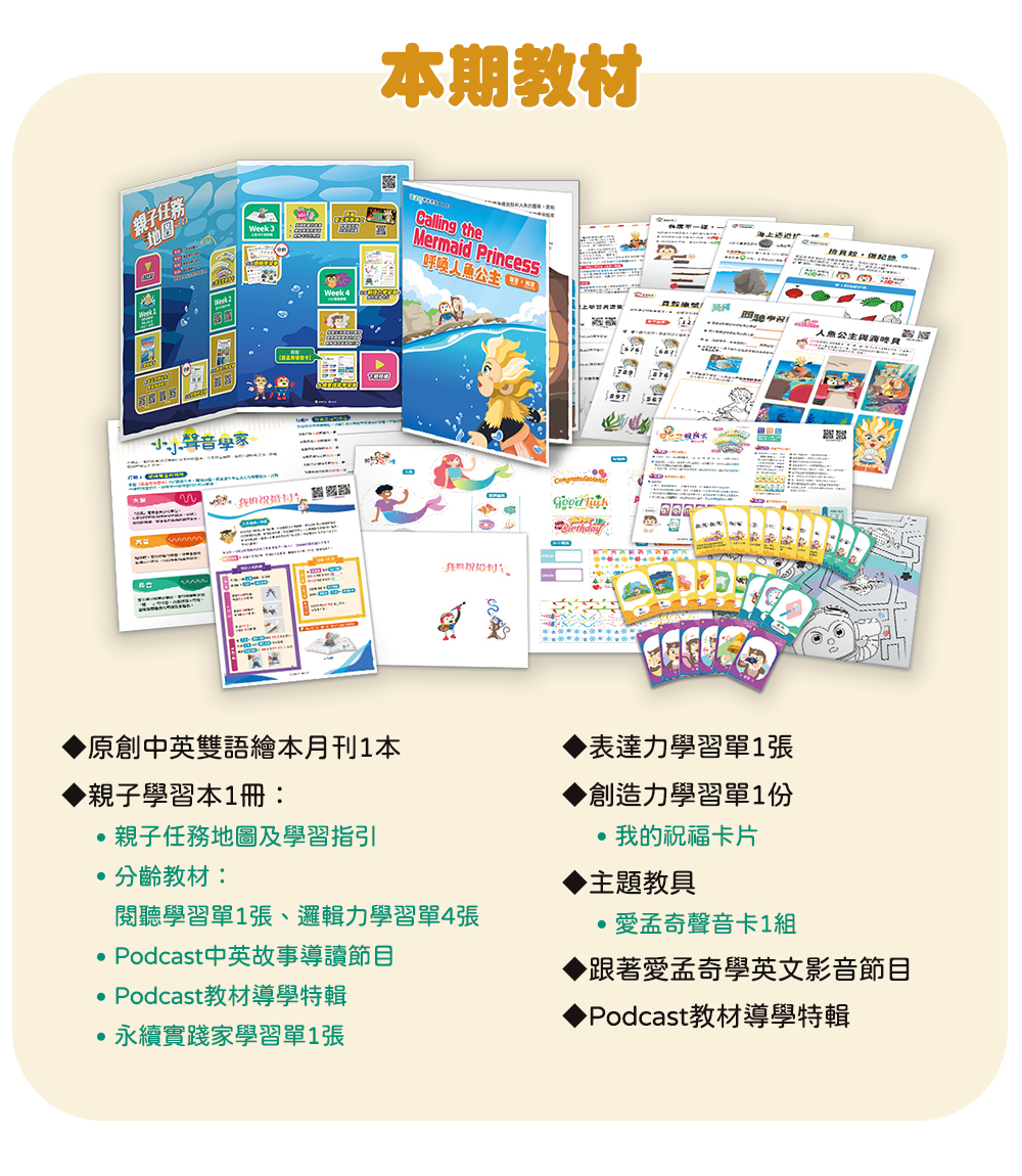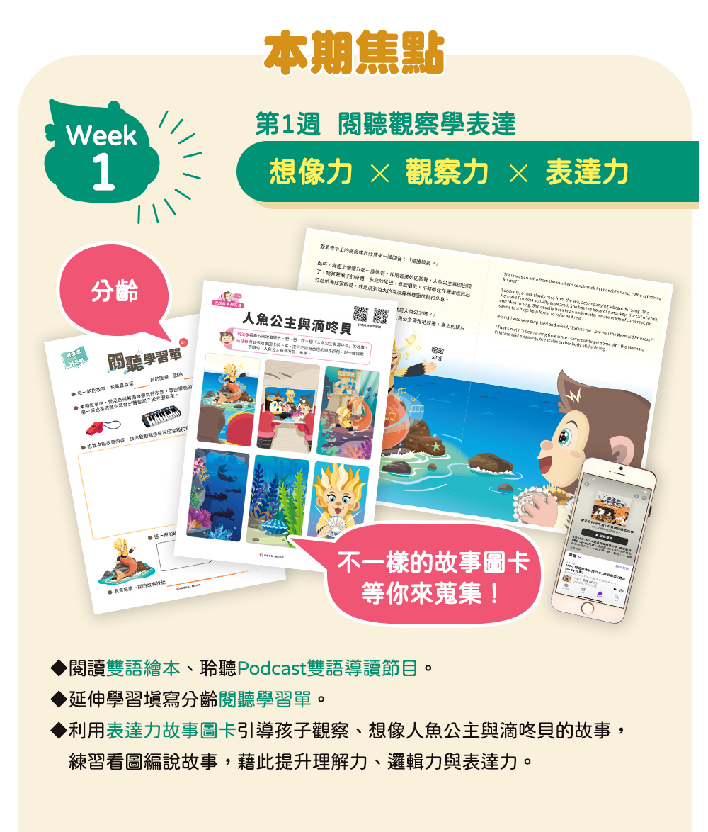專為2-6歲幼兒量身設計的雙語繪本月刊,依據繪本故事內容,推出專屬Podcast雙語導讀節目、特製桌遊圖卡及任務學習單,透過五感學習,提升孩子的邏輯力、表達力、品格力與創造力,進而啟動思辨能力!