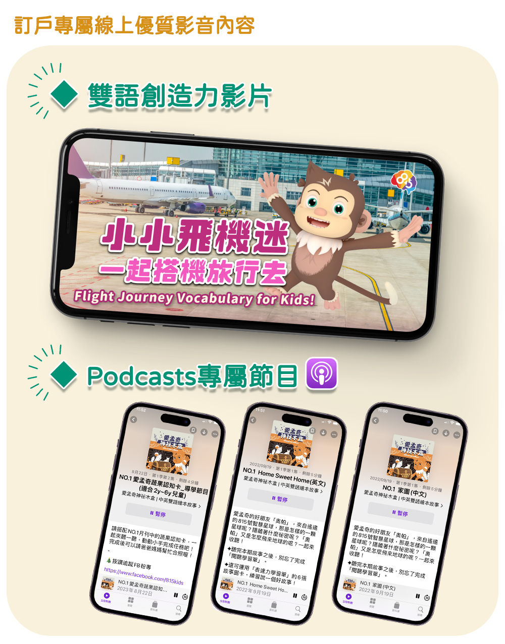 專為2-6歲幼兒量身設計的雙語繪本月刊,依據繪本故事內容,推出專屬Podcast雙語導讀節目、特製桌遊圖卡及任務學習單,透過五感學習,提升孩子的邏輯力、表達力、品格力與創造力,進而啟動思辨能力!