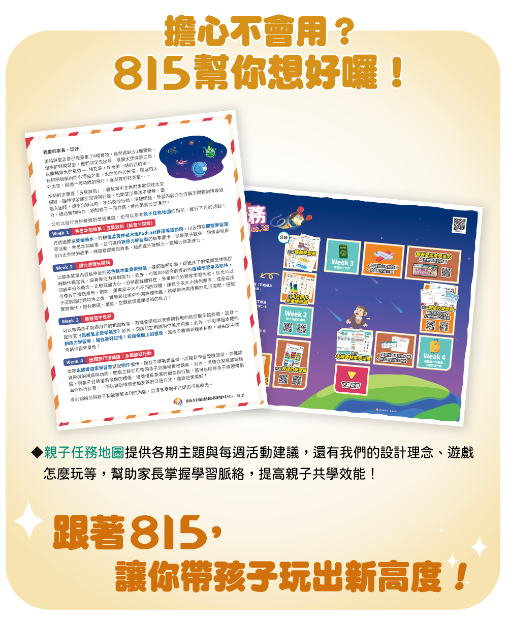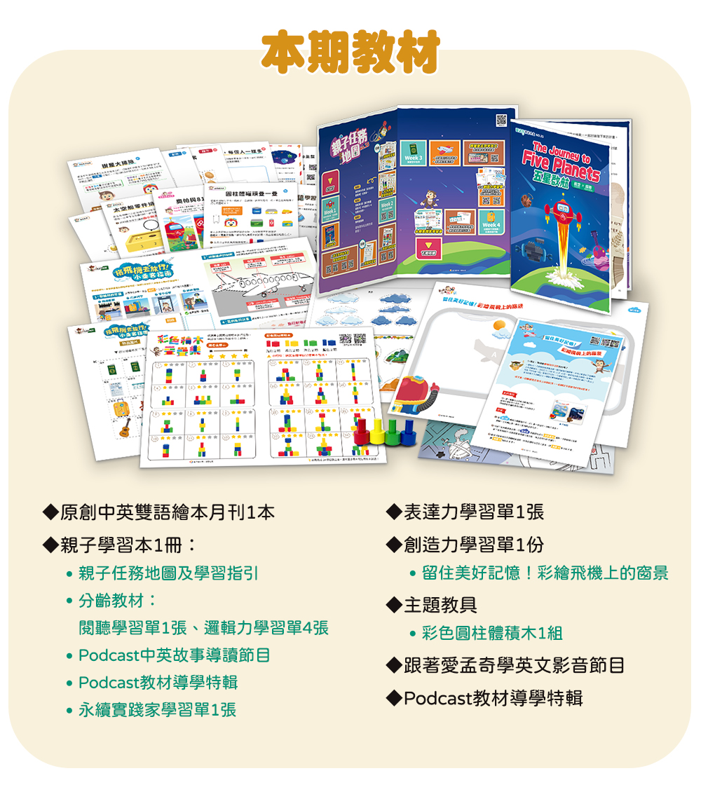 本期的主題是「五星啟航」,藉故事中主角們勇敢前往太空探險,延伸學習航空知識與行動,也期望引導孩子理解,當陷入困境,想不出辦法時,不妨勇於行動、突破問題,學習內容亦包含解決問題的情境設計,結合實物操作,期盼親子一同共讀,進而落實於生活中。