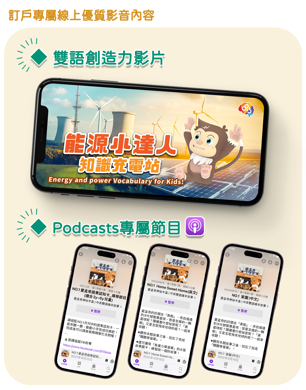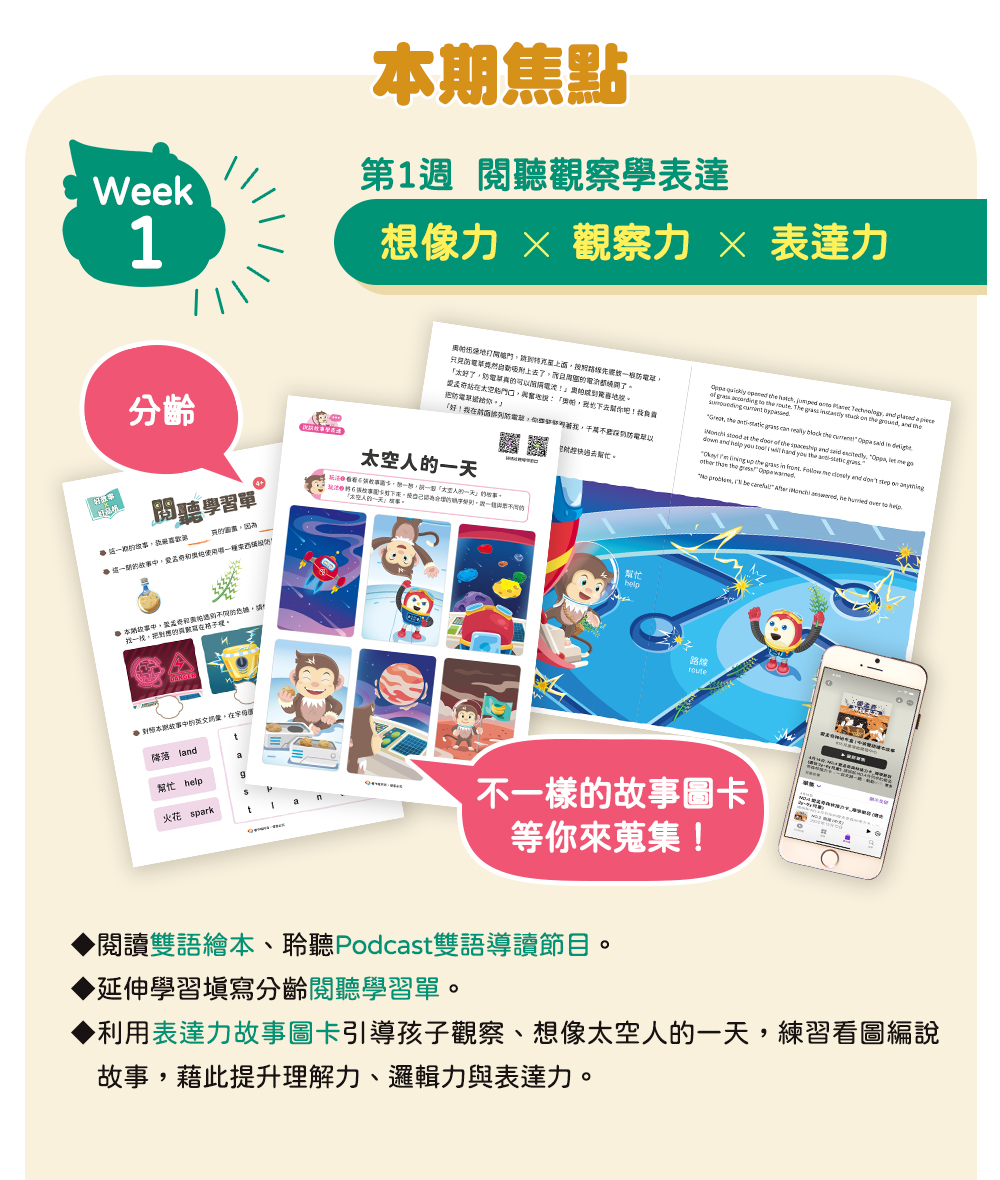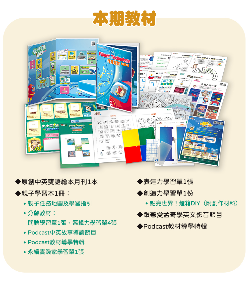 專為2-6歲幼兒量身設計的雙語繪本月刊,依據繪本故事內容,推出專屬Podcast雙語導讀節目、特製桌遊圖卡及任務學習單,透過五感學習,提升孩子的邏輯力、表達力、品格力與創造力,進而啟動思辨能力!