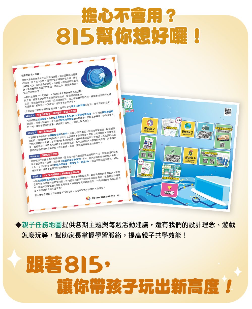 本期的主題是「特克星球」,透過故事主角們在特克星面臨的危機,期望引導孩子理解勇於面對挫折,積極解決問題的態度,並藉由特克星的特性,延伸設計能源、電力相關的學習內容,將繪本情境結合實際生活應用,期盼親子一同共讀,進而落實於生活中。