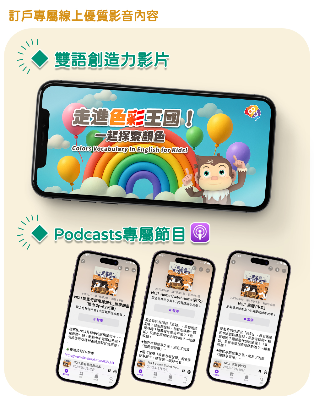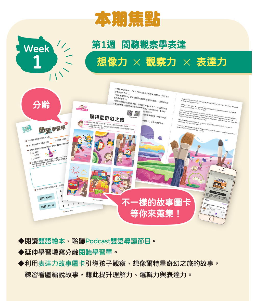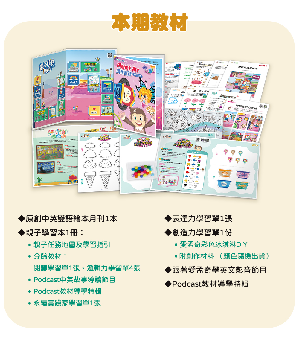 專為2-6歲幼兒量身設計的雙語繪本月刊,依據繪本故事內容,推出專屬Podcast雙語導讀節目、特製桌遊圖卡及任務學習單,透過五感學習,提升孩子的邏輯力、表達力、品格力與創造力,進而啟動思辨能力!