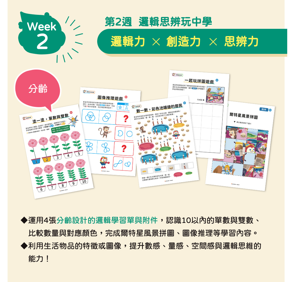 ✦分齡教材:閱聽學習單1張、邏輯力學習單4張
