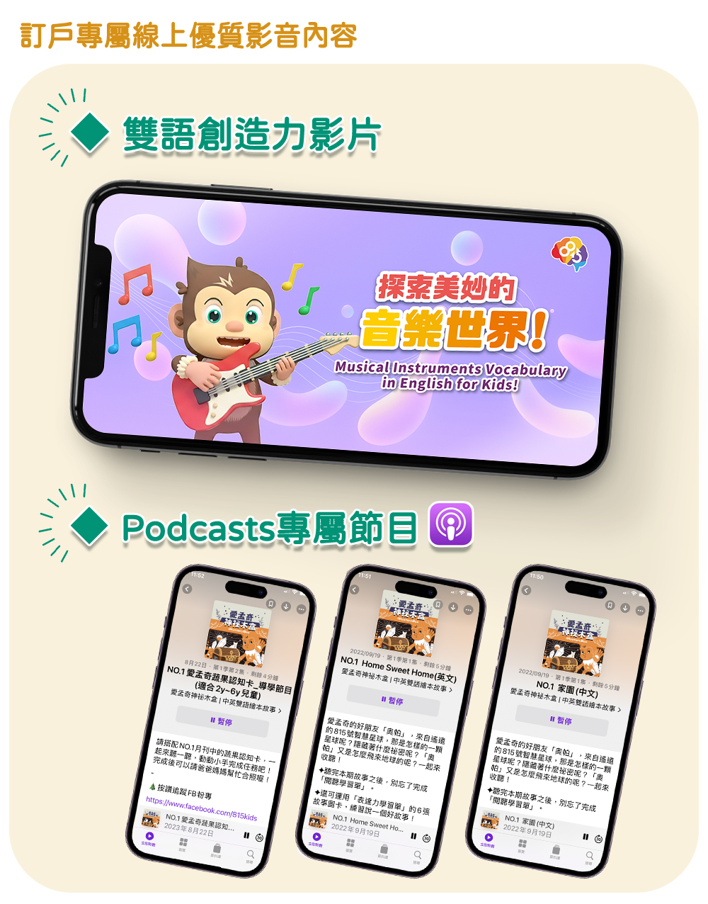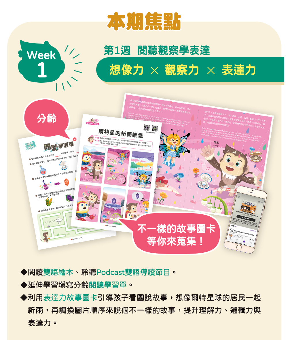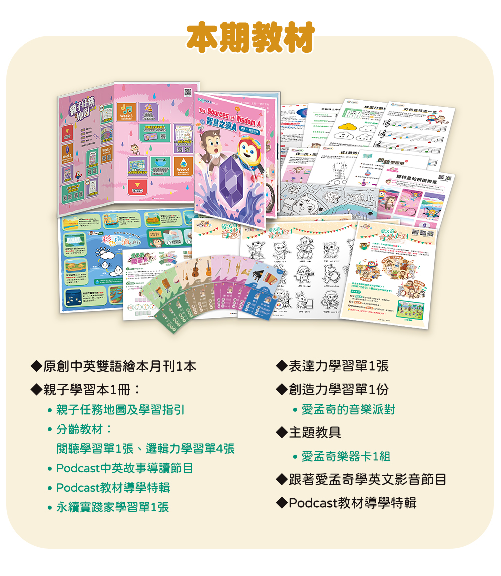 專為2-6歲幼兒量身設計的雙語繪本月刊,依據繪本故事內容,推出專屬Podcast雙語導讀節目、特製桌遊圖卡及任務學習單,透過五感學習,提升孩子的邏輯力、表達力、品格力與創造力,進而啟動思辨能力!