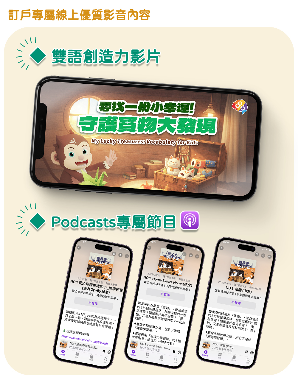 專為2-6歲幼兒量身設計的雙語繪本月刊,依據繪本故事內容,推出專屬Podcast雙語導讀節目、特製桌遊圖卡及任務學習單,透過五感學習,提升孩子的邏輯力、表達力、品格力與創造力,進而啟動思辨能力!