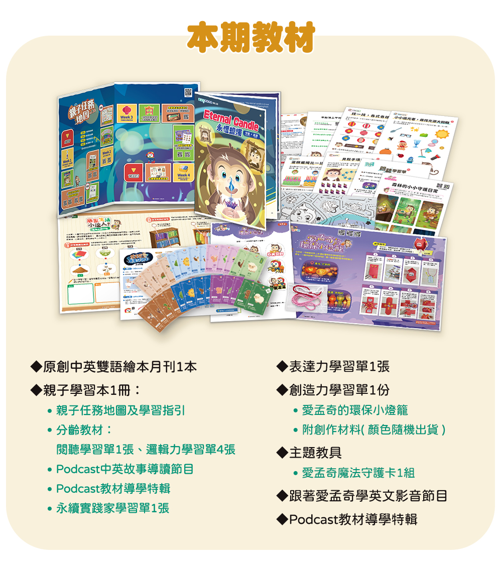 本期的主題是「永恆蠟燭」,藉由探險故事情節的回憶,延伸設計出相關的學習活動,期盼親子一同共讀及探索學習。
