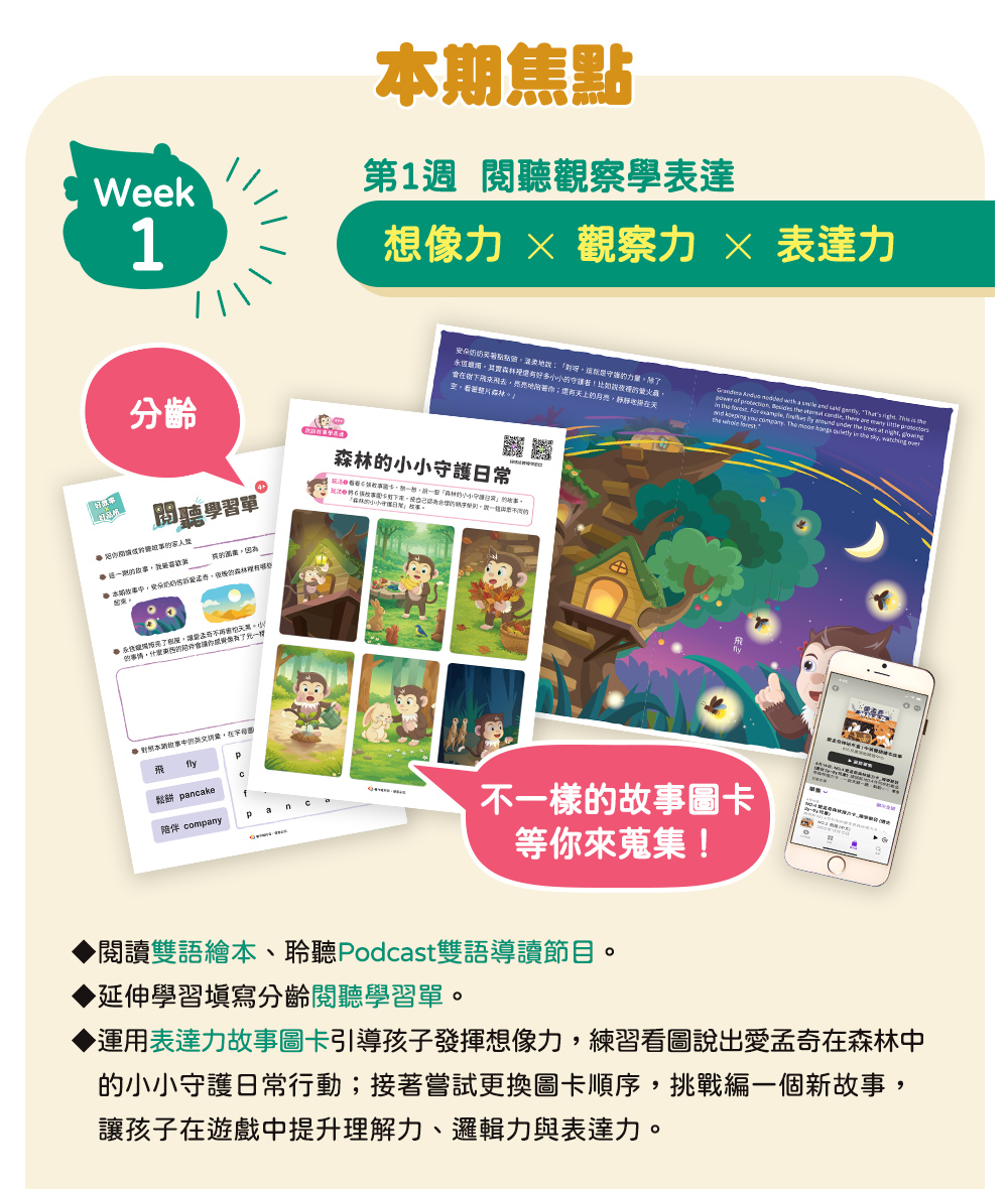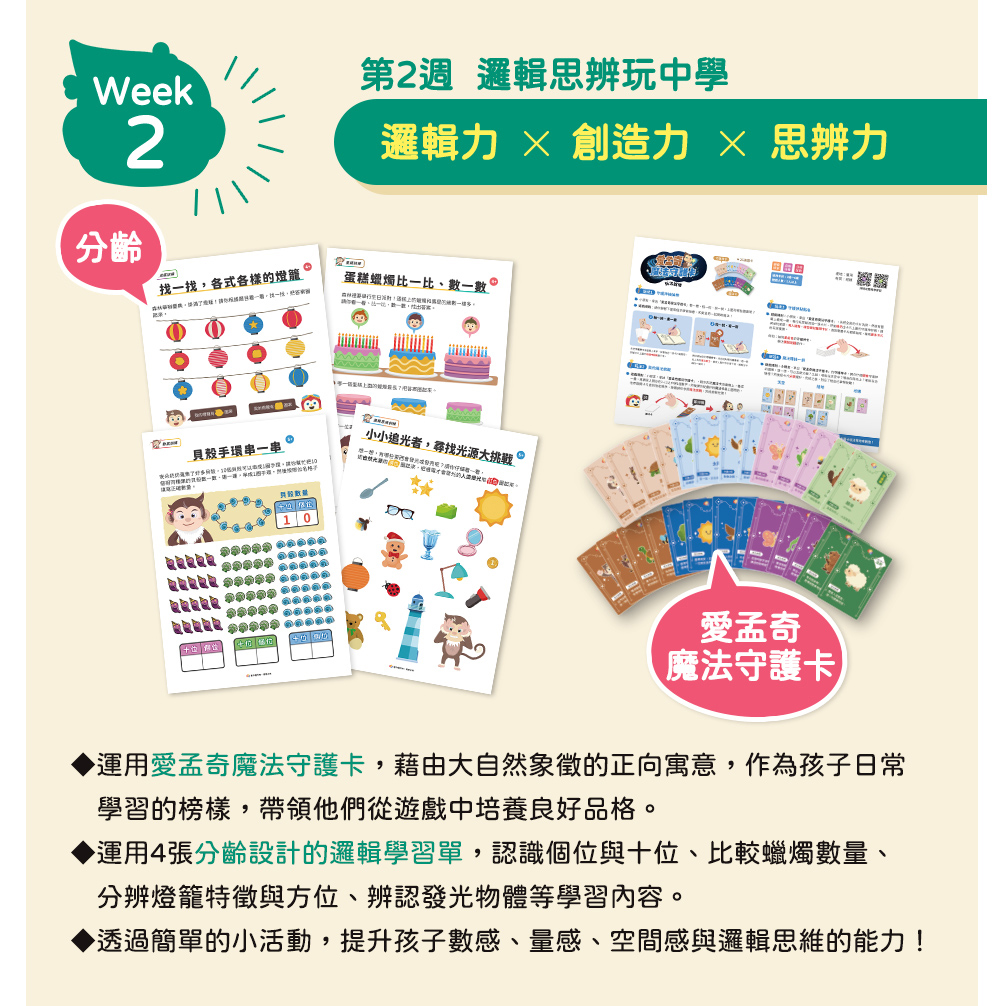 ✦分齡教材:閱聽學習單1張、邏輯力學習單4張