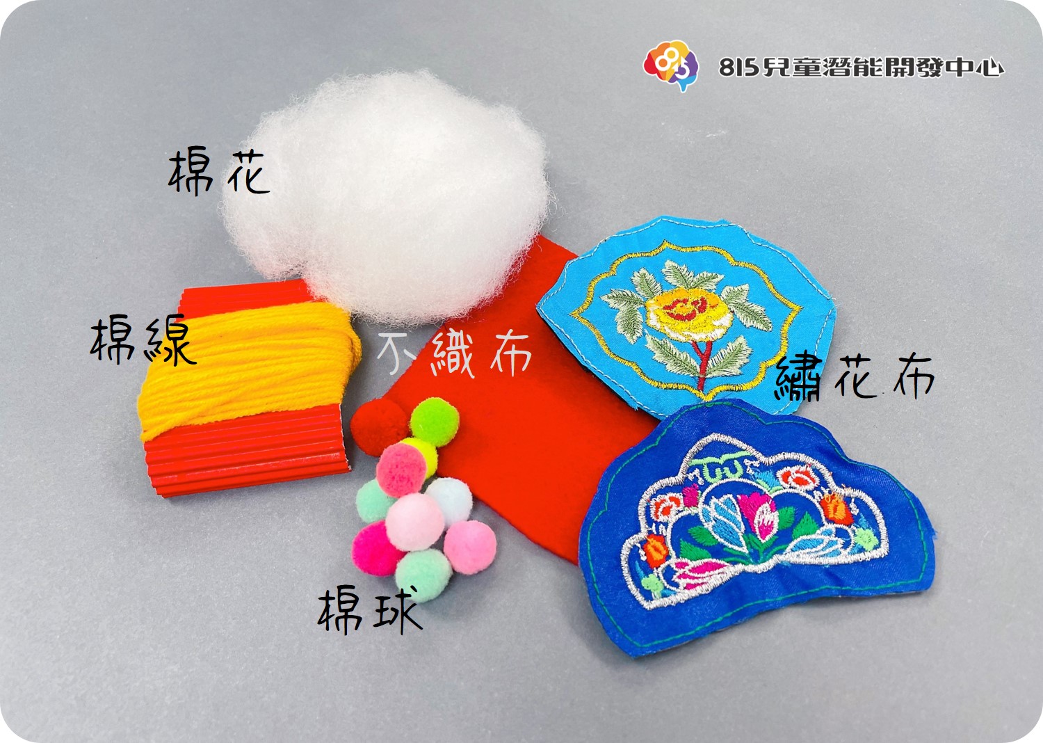 材料包內含:繡花布(花色隨機)2片、不織布1片、棉球數顆、棉花、棉線