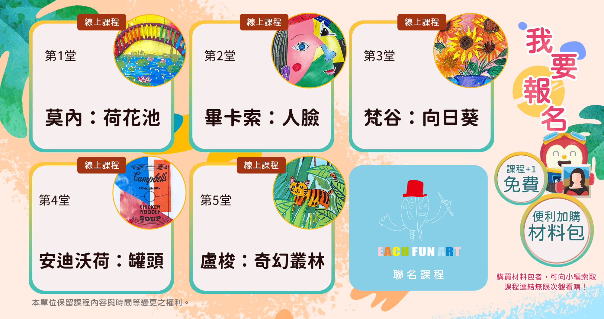 本次大師風格班是由小朋友們最愛的《 Each Art 創意想像空間-豐原繪本館 》橘子和Monkey老師們設計,專為孩子打造的專屬課程與可供加購的材料包,爸媽不用冒險出門奔波採買,打開材料包配合即可與老師一起完成大師創作。