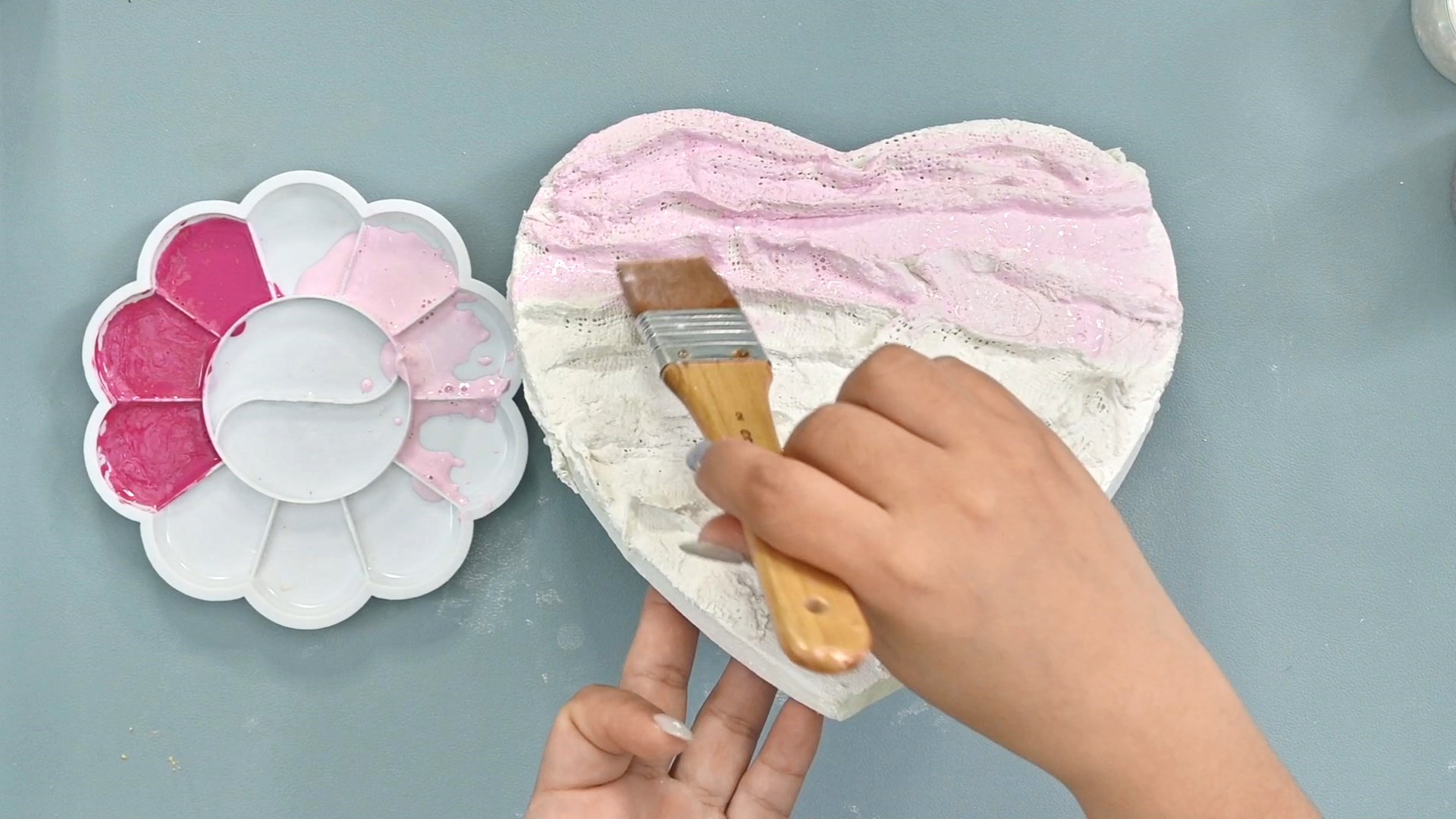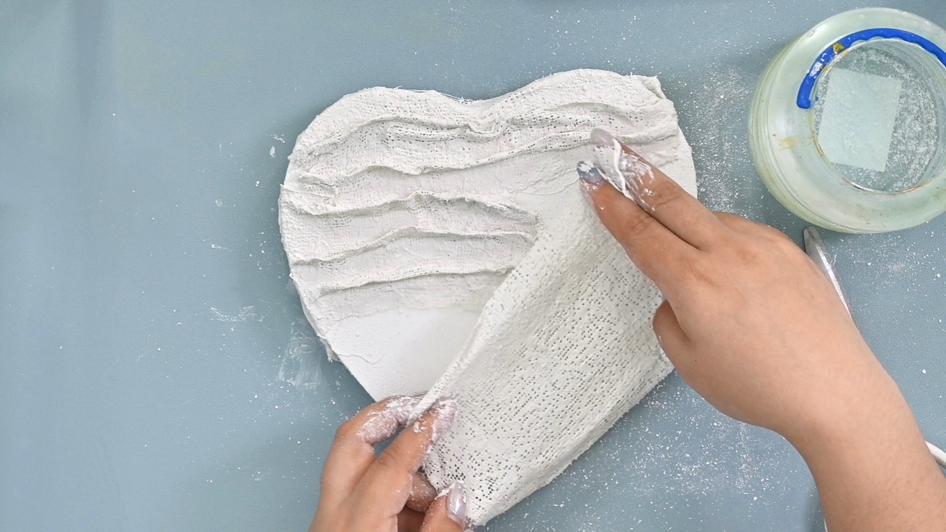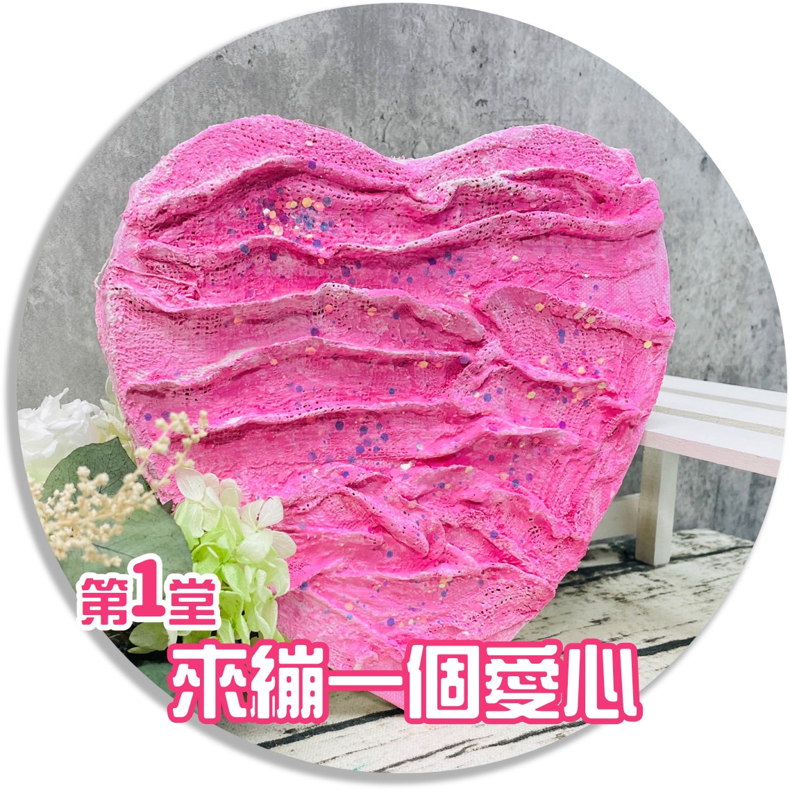 《來繃一個愛心》在愛心形狀的畫板上,以石膏繃帶隨性堆疊,製作出不規則立體感,再搭配上自己喜歡的色彩,完成一幅令人眼睛一亮的心意之作!