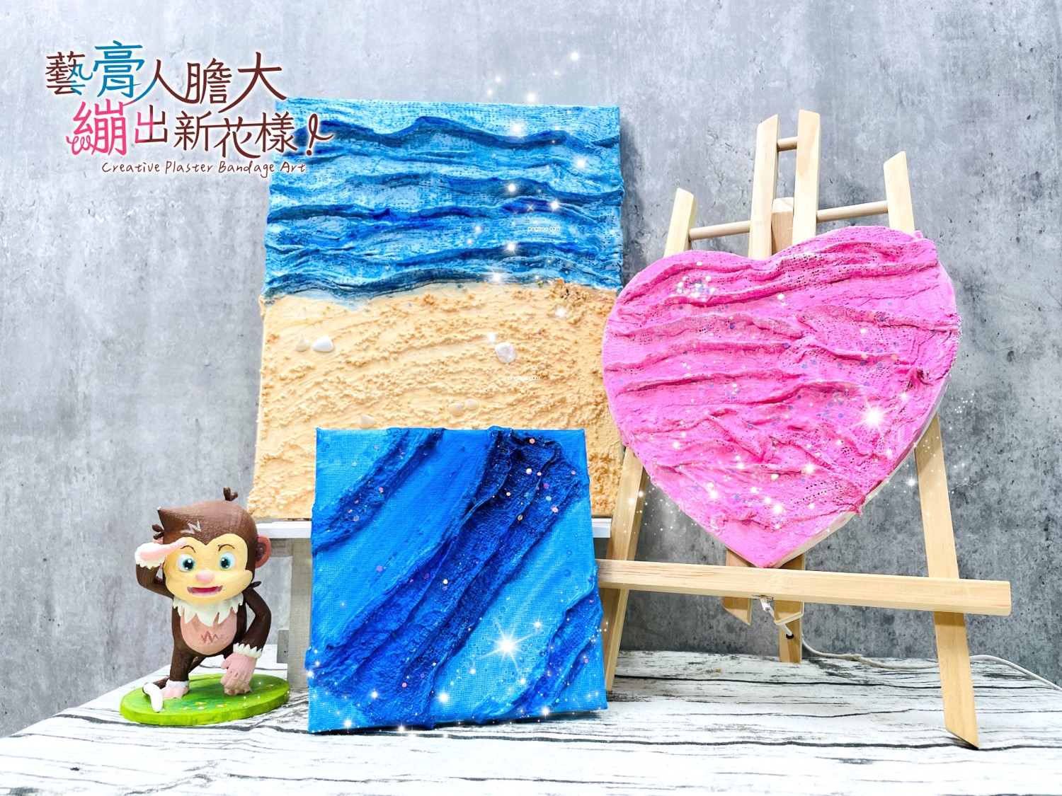我們不只是用石膏來創作,還加入了「繃帶」這個神奇元素,以石膏為基底,加入「繃帶」元素,讓作品從平面延伸出豐富的立體層次,彷彿藝術品從平面中跳了出來!
