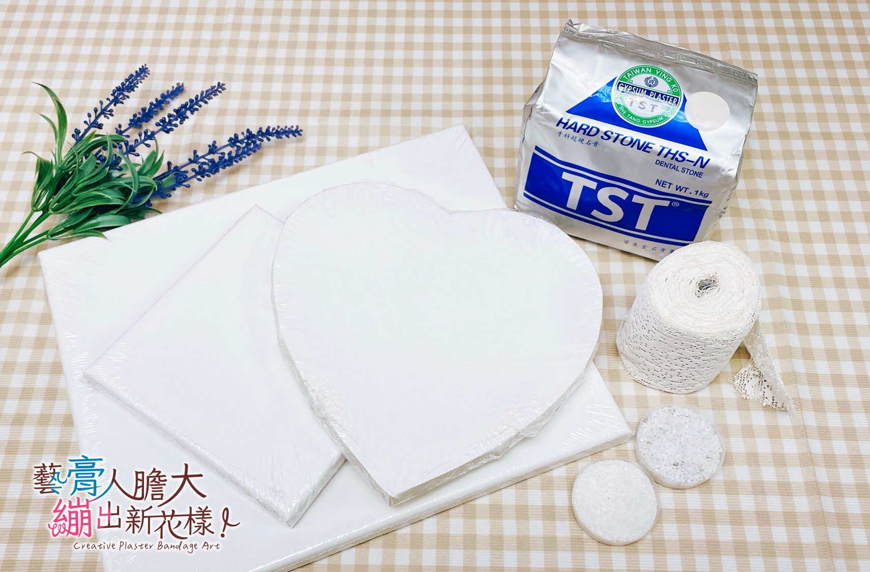 石膏粉(1kg)、石膏繃帶、畫板3塊(心型20×20cm、正方形15×15cm、長方形30×25cm)、石英沙(粗/細)。