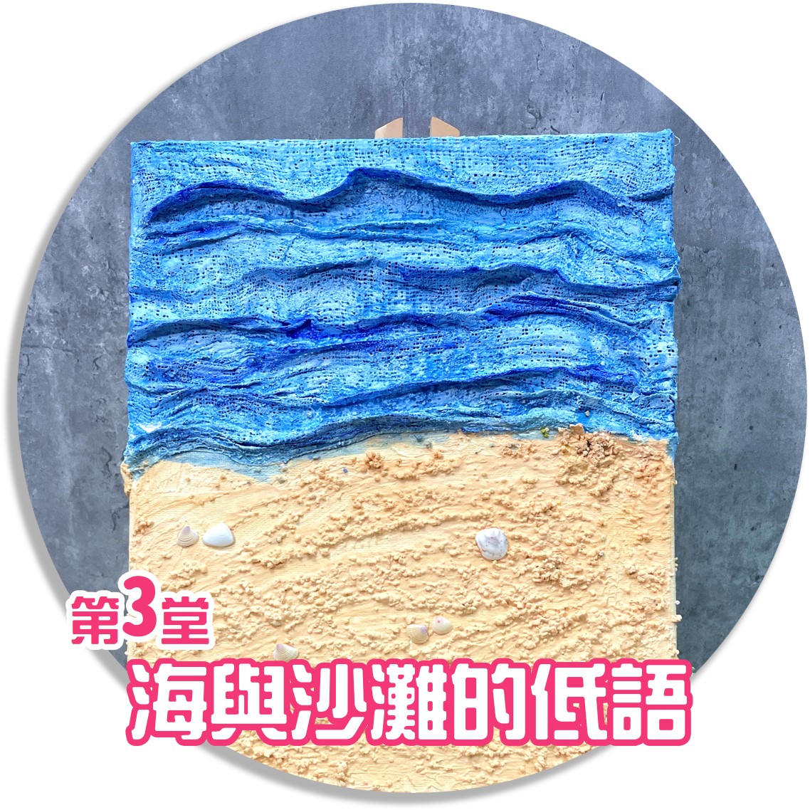 《海與沙灘的低語》運用石膏繃帶打造出海浪起伏的波紋,再以石英砂混合石膏,塑造出細緻的沙灘質感,最後點綴上貝殼小飾品,彷彿將夏日海邊的美好記憶,通通收進畫作裡。