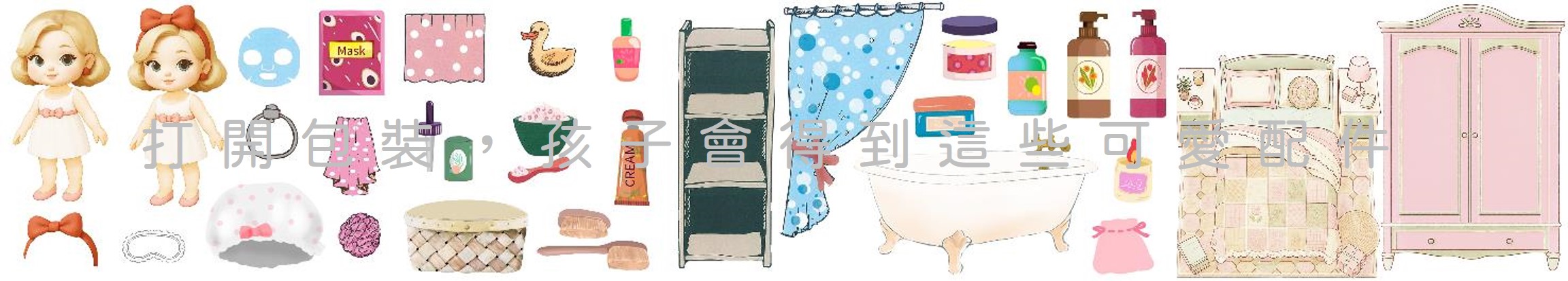 內含2個人物造型 + 28個造型配件 + 1造型衣櫥 + 1精美床鋪