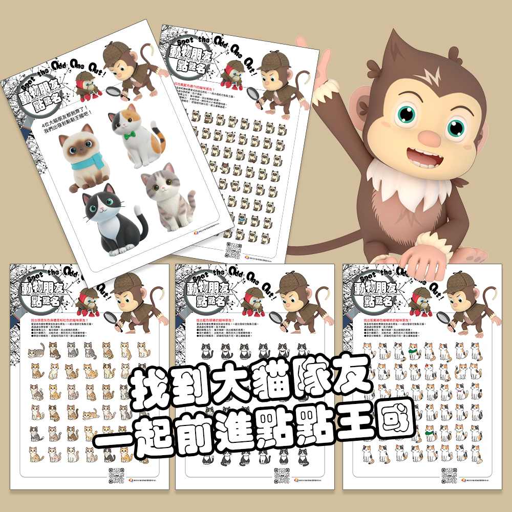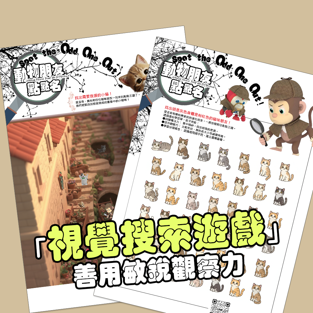 故事開端由「尋找四位大貓朋友」切入,再到街道中尋找需要受傷的小貓,利用「找找看(Hidden Pictures)」的玩法,訓練孩子的視覺辨識能力與耐心,讓孩子在玩樂中提升對圖像細節的敏感度。