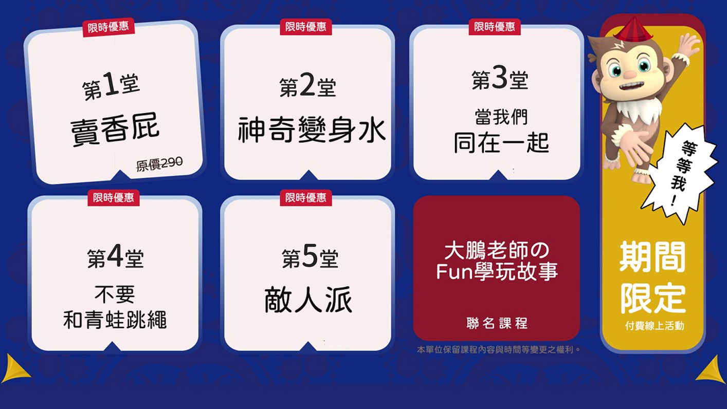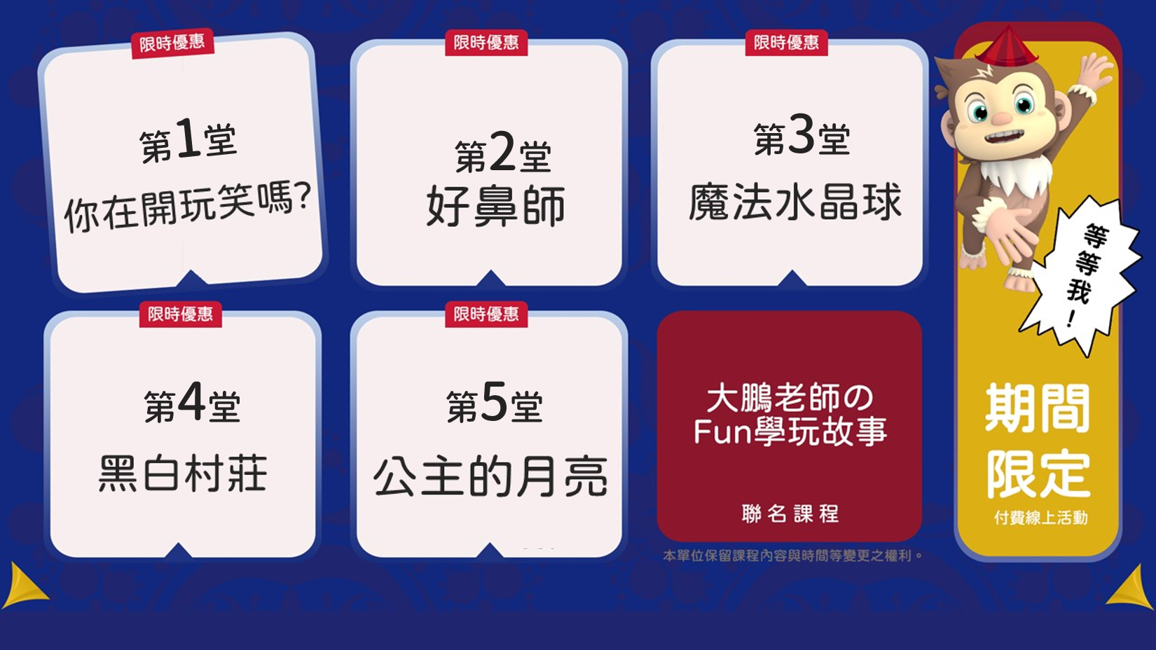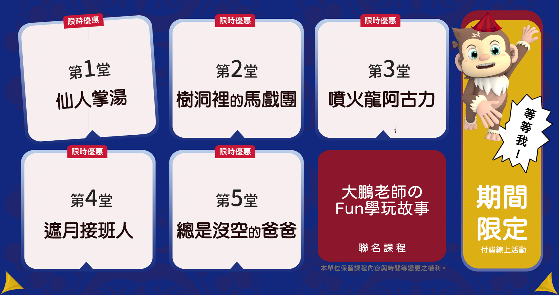 深受小朋友喜愛的故事玩家大鵬老師來囉! 這次特別收錄20堂戲劇課作品,不限時觀看,讓孩子在家個有動有靜的特別課堂,邀孩子一起說說演演動一動吧!