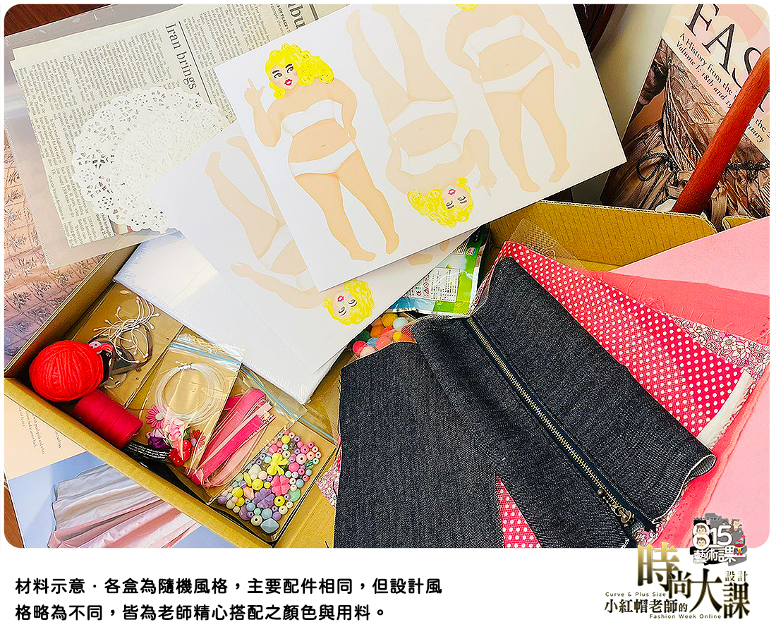 時裝週材料盒內容物:油畫布、印花布、紗、拉鍊丹寧布包半成品、不織布、緞帶、小花、珠珠、毛球、進口美術紙、手縫線、英文報紙、蕾絲紙模、毛線、檔球、8字環、圓環、鐵勾、釣魚線