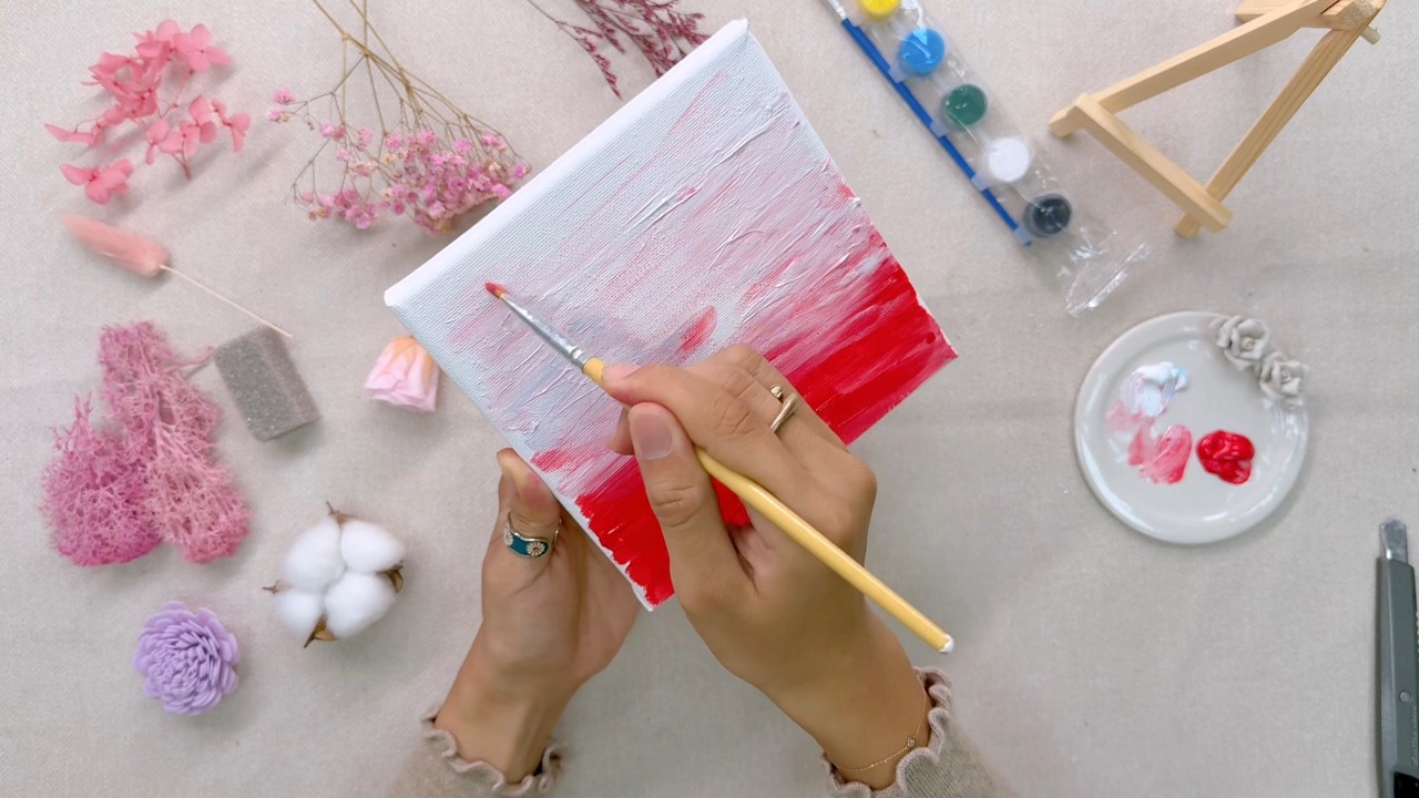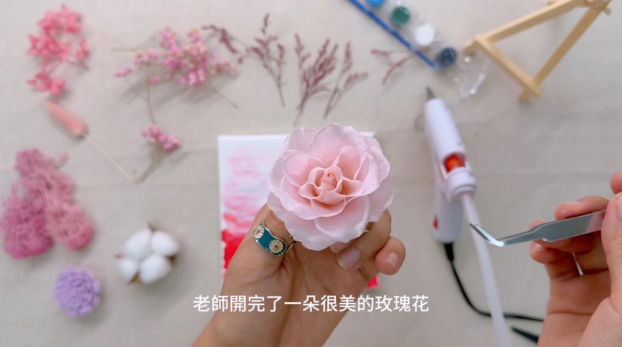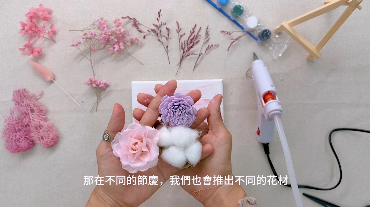 從最基本的花材認識,到花材整理、永生玫瑰花開花技巧,以及成品花材配置與如何在畫布上繪出有層次手繪感立體壓克力畫的分享唷!