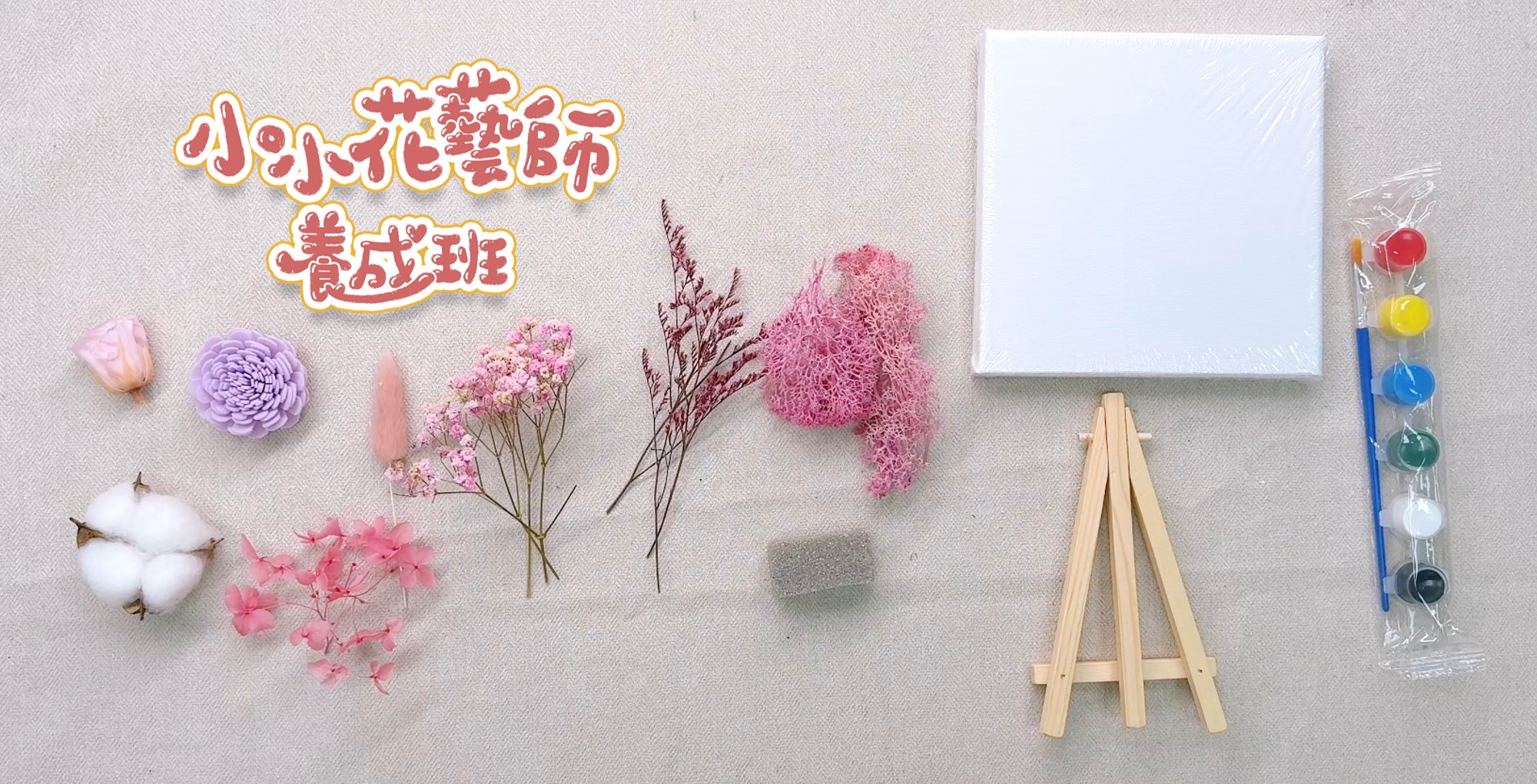 擴香花、永生玫瑰花、棉花、永生繡球花、永生青苔、滿天星、染色卡斯、兔尾草、15x15cm油畫布、小型畫架、6色3ml壓克力顏料、畫筆、乾燥花專用海綿