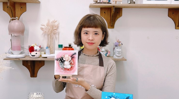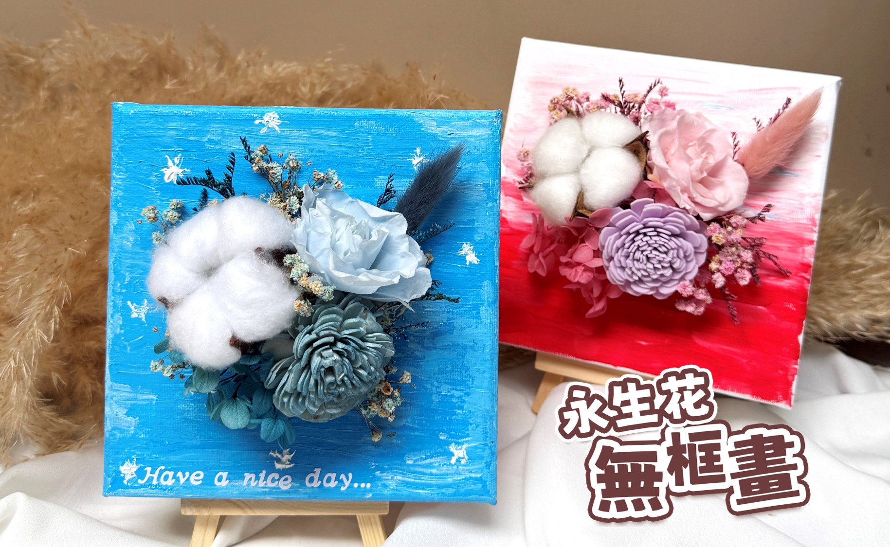 這次的永生花無框畫,將永生花與壓克力畫結合,複合式的媒材創作,不僅保留永生花的細膩輪廓,搭配手繪畫布材質的背景,讓立體壓克力畫圍繞著永生花,更有一番手繪的溫度在裡面!