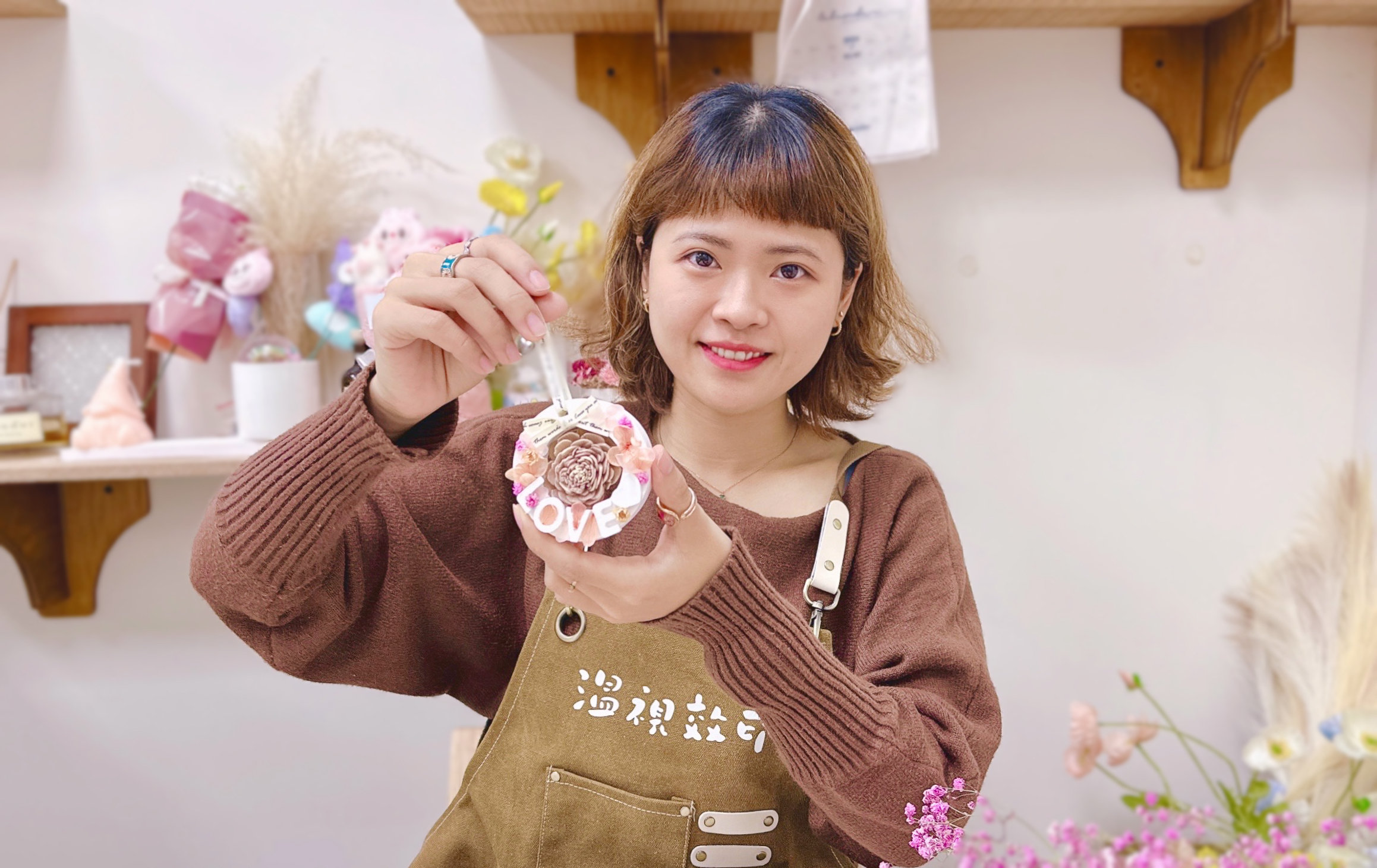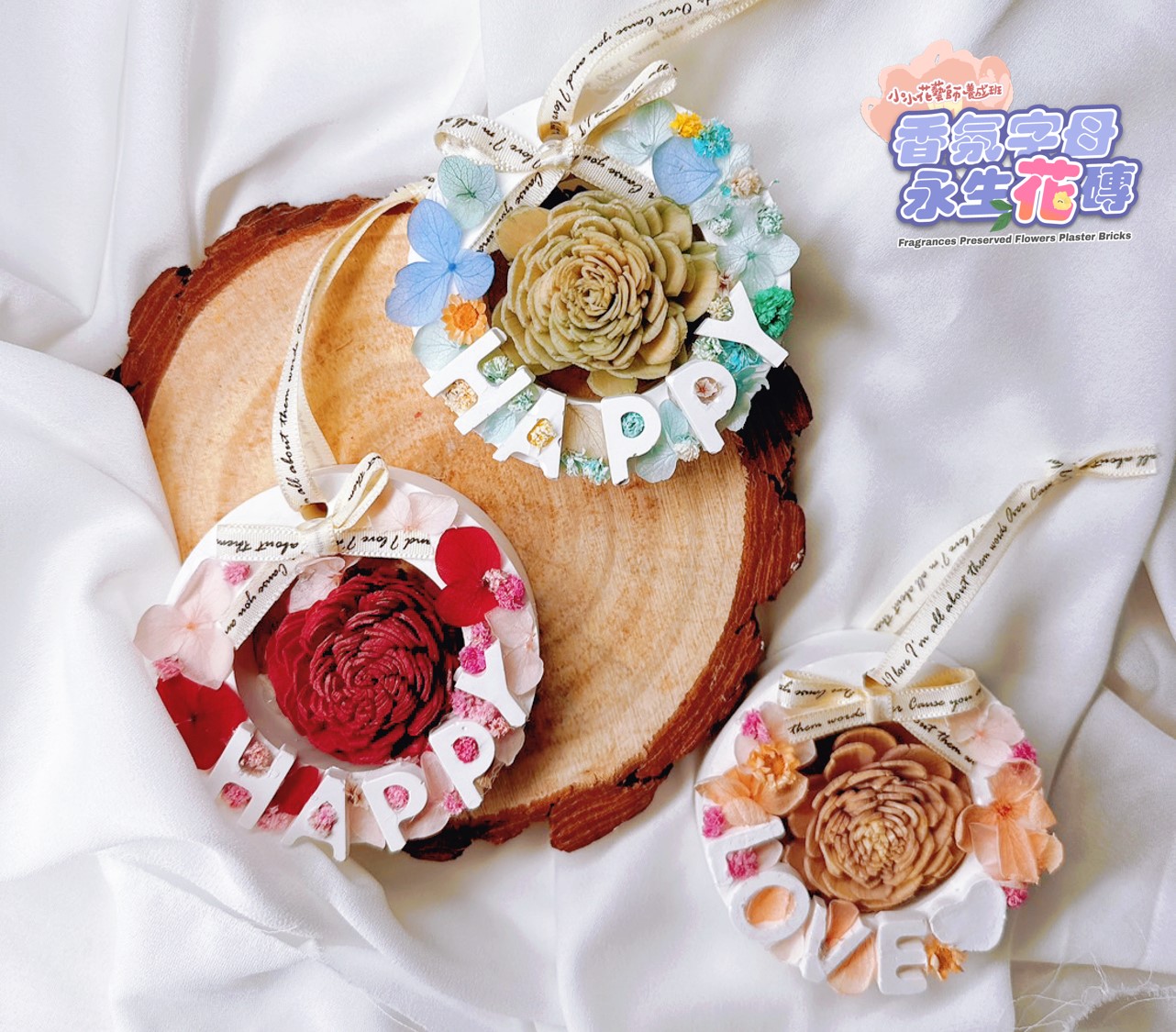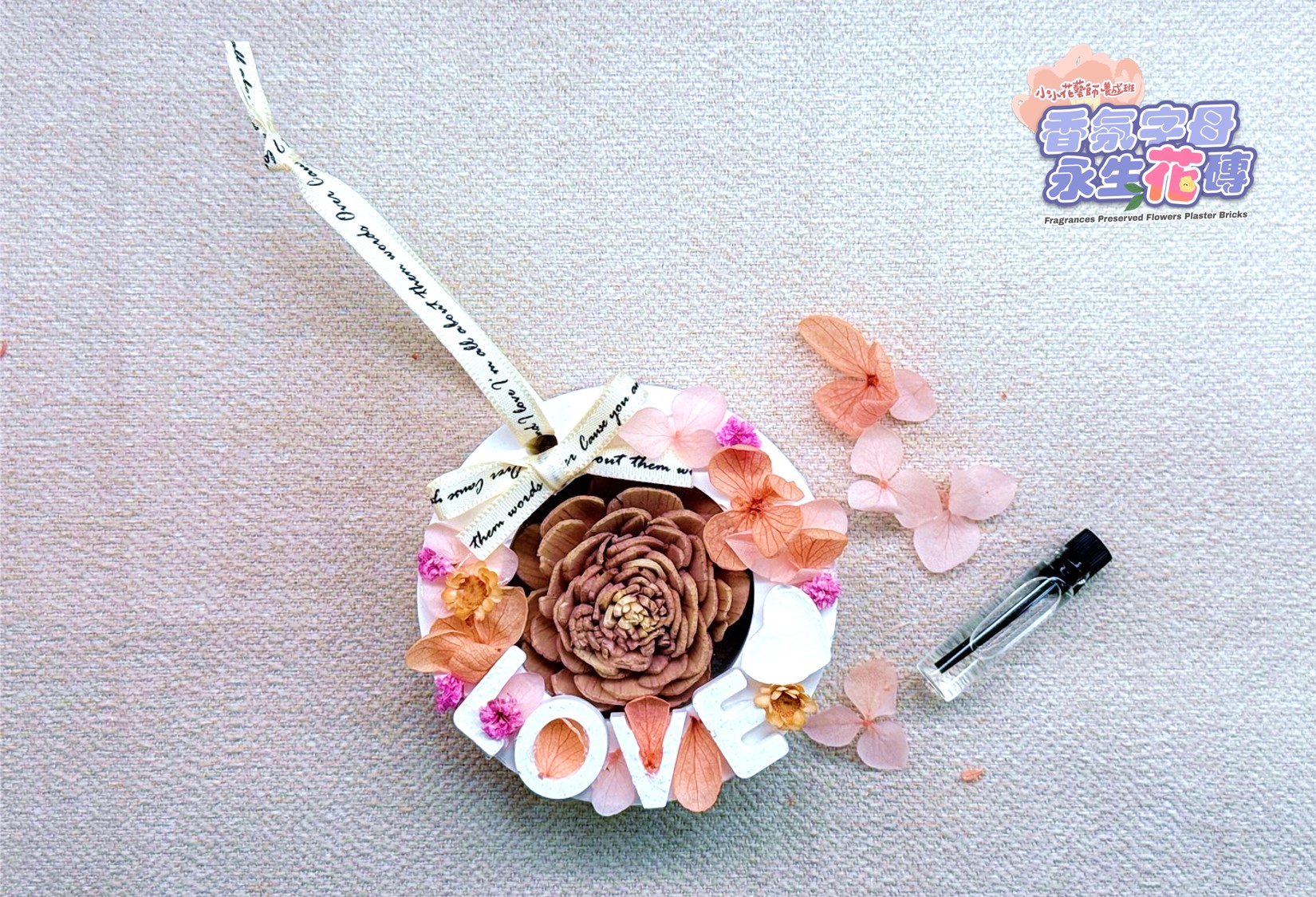 - 香氛×花藝×設計感:永生花與專屬石膏字母結合,兼具藝術與實用性。