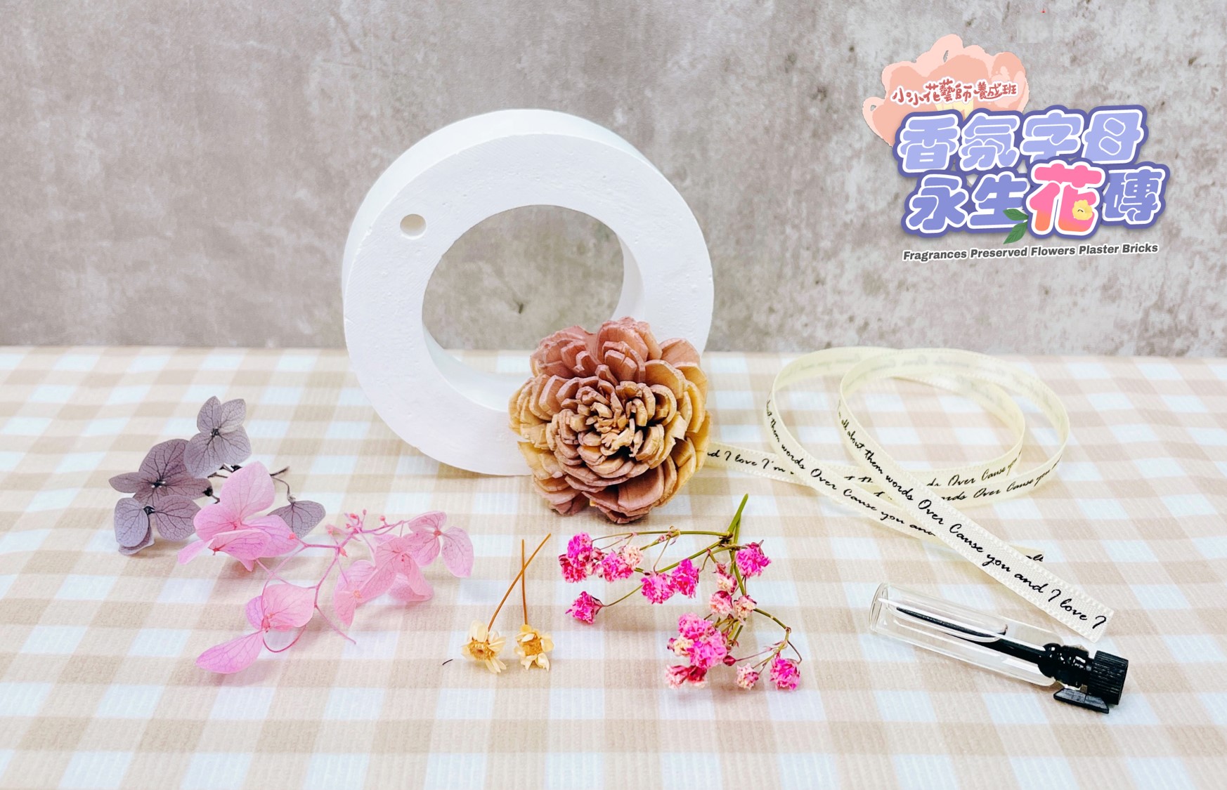 擴香花、永生繡球花、滿天星、小星花、圓形石膏磚、緞帶、香水(香味隨機)、石膏字母(購買時請填寫指定英文字母)