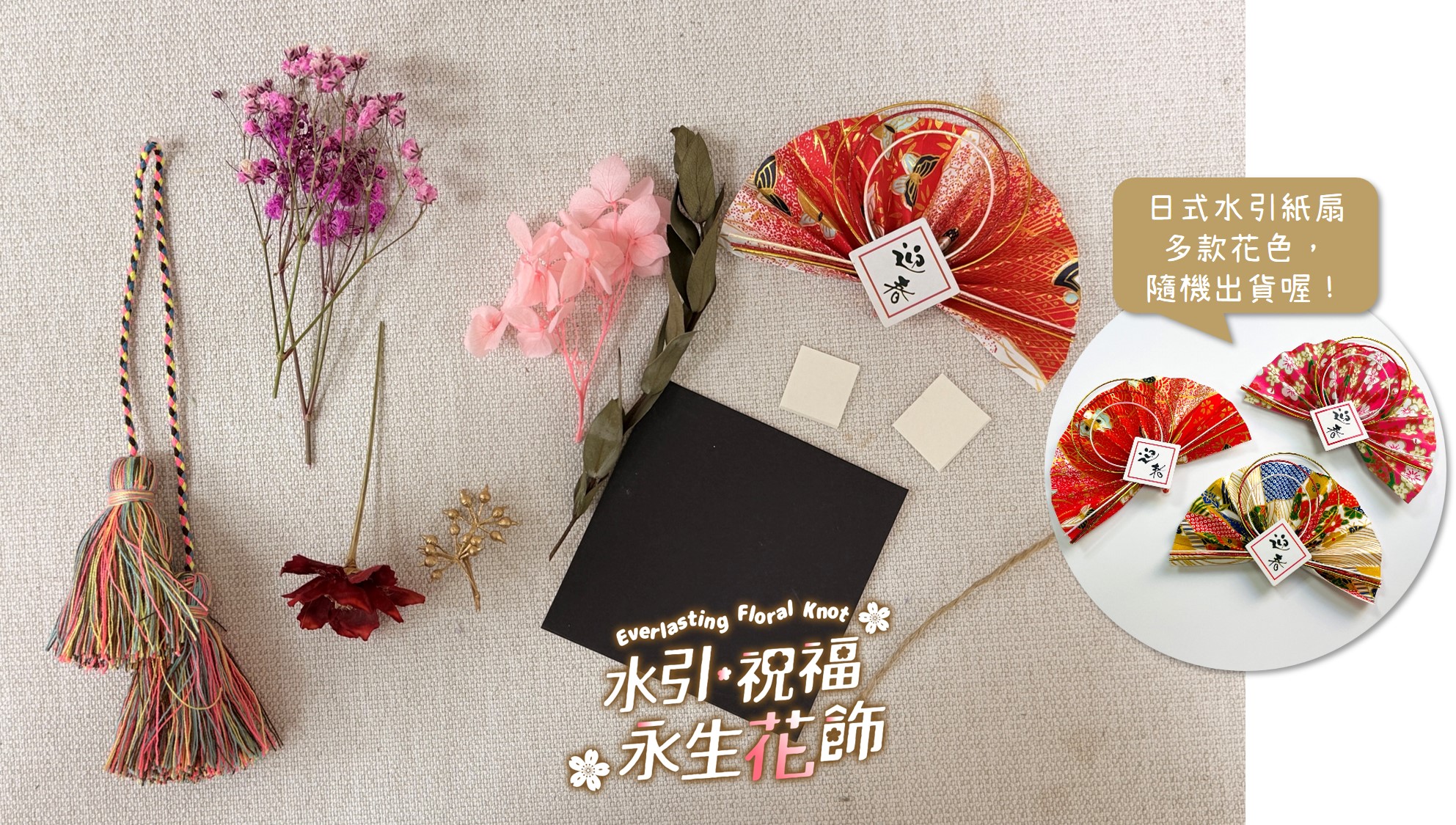 從最基本的花材認識,到花材整理、花材搭配,以及插花技法、位置配置與視覺比例的分享,將永生花、日式水引紙扇完美結合!