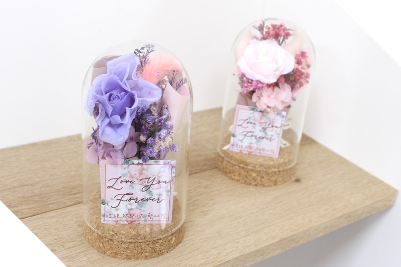 永生玫瑰花、兔尾草、永生繡球花、滿天星、染色卡斯、玻璃花盅(軟木塞款)、包裝紙一份、小卡片、緞帶、鐵絲