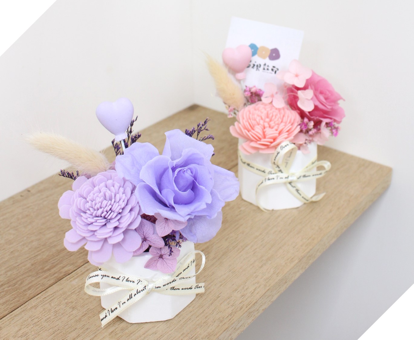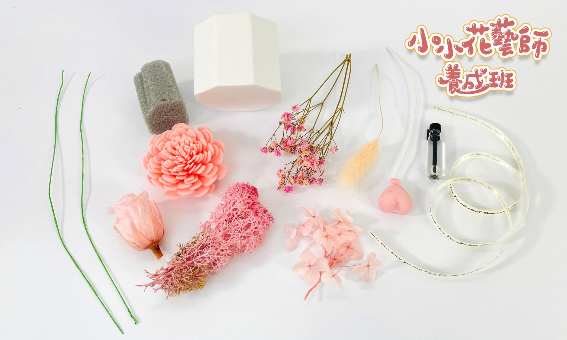 永生玫瑰花、擴香花、永生繡球花、永生青苔、滿天星、兔尾草、石膏盆栽、愛心氣球便箋夾、香精、乾燥花專用海綿、緞帶、鐵絲